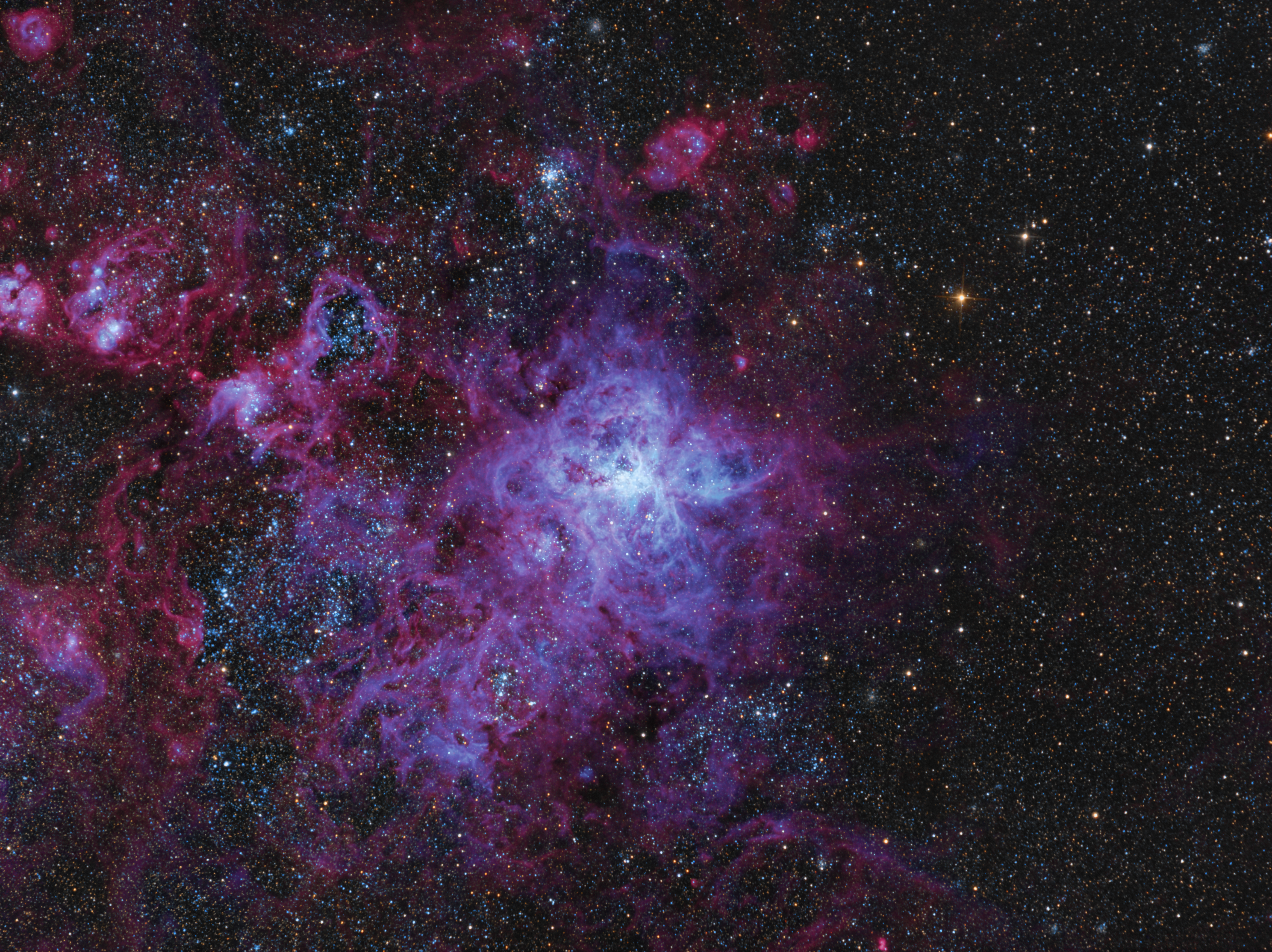 Der Tarantelnebel in der Großen Magellanschen Wolke ist wahrlich ein Nebel der Superlative – er ist das größte bekannte Sternentstehungsgebiet der lokalen Galaxiengruppe und enthält mit R136a1 auch den mit ca. 265 Sonnenmassen massereichsten bekannten Stern. Die Feinstruktur der im Wasserstoff und Sauerstoff leicht unterschiedlich leuchtenden Filamente ist bemerkenswert, oft sind die Strukturen leicht verschoben wie bei einem 3-D-Farbbild.