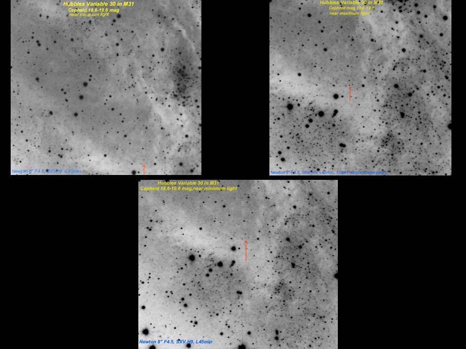 Um einen Cepheiden im Maximum zu erhaschen, braucht man viel Geduld und Glück. Bei einer Periode von 30 Tagen ist er nur etwa vier Tage in Maximumnähe. Pech hat man, wenn das Maximum dann in die Vollmondphase fällt. Hier eine Collage, die die unterschiedliche Helligkeit des Variablen Nr. 30 dokumentiert.
