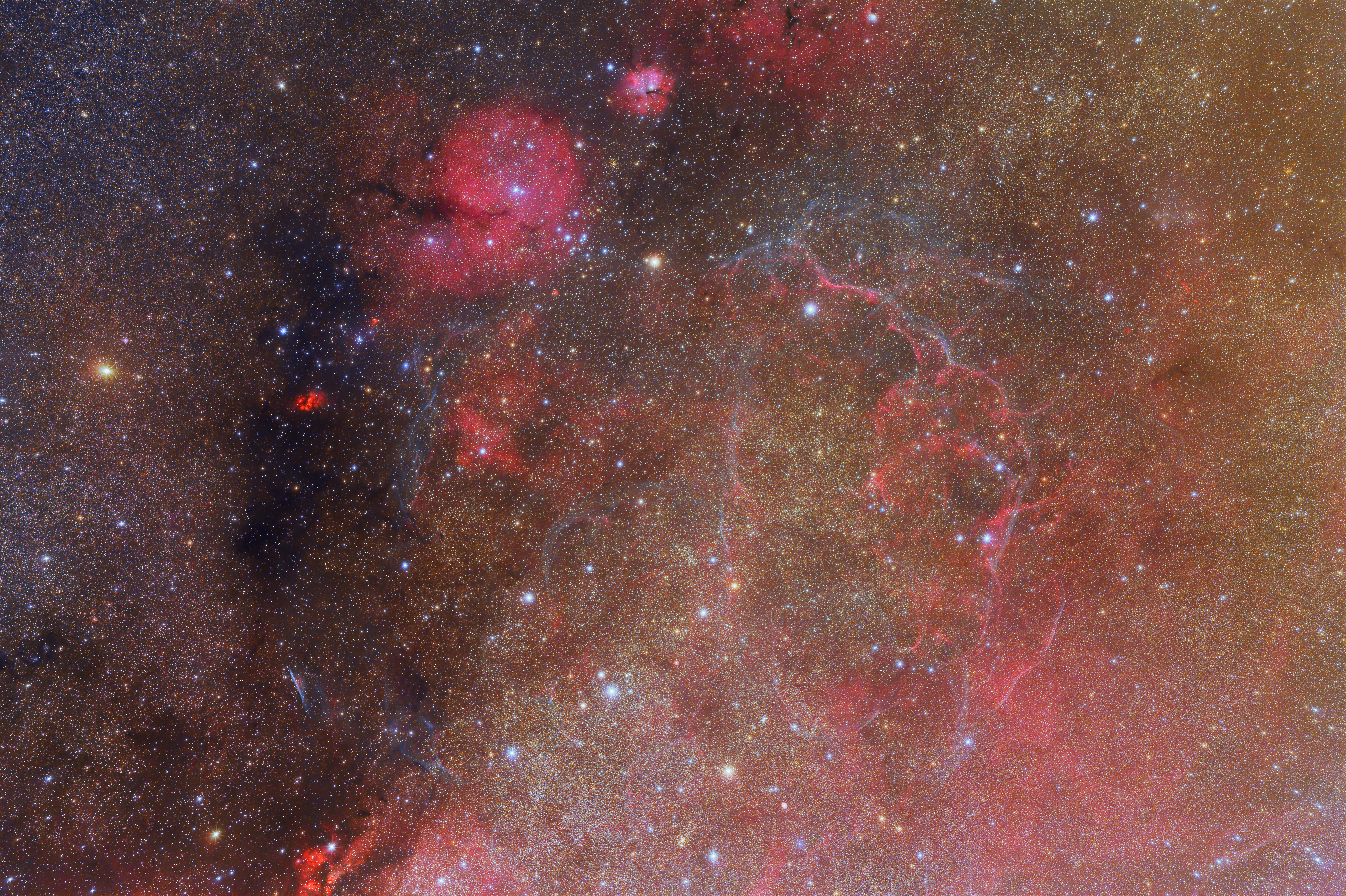 Ich hatte zwar gehofft, aber nicht erwartet, dass sich die zarten Filamente des Vela Supernova-Überrests mit der modifizierten DSLR abbilden lassen. Bisher waren mir fast ausschließlich CCD-Aufnahmen bekannt. Im linken unteren Bereich befindet sich NGC 2736, Herschels Bleistift. Der gelbe Stern am linken Rand in der Bildmitte ist Lambda Velorum, auch Alsuhail genannt.