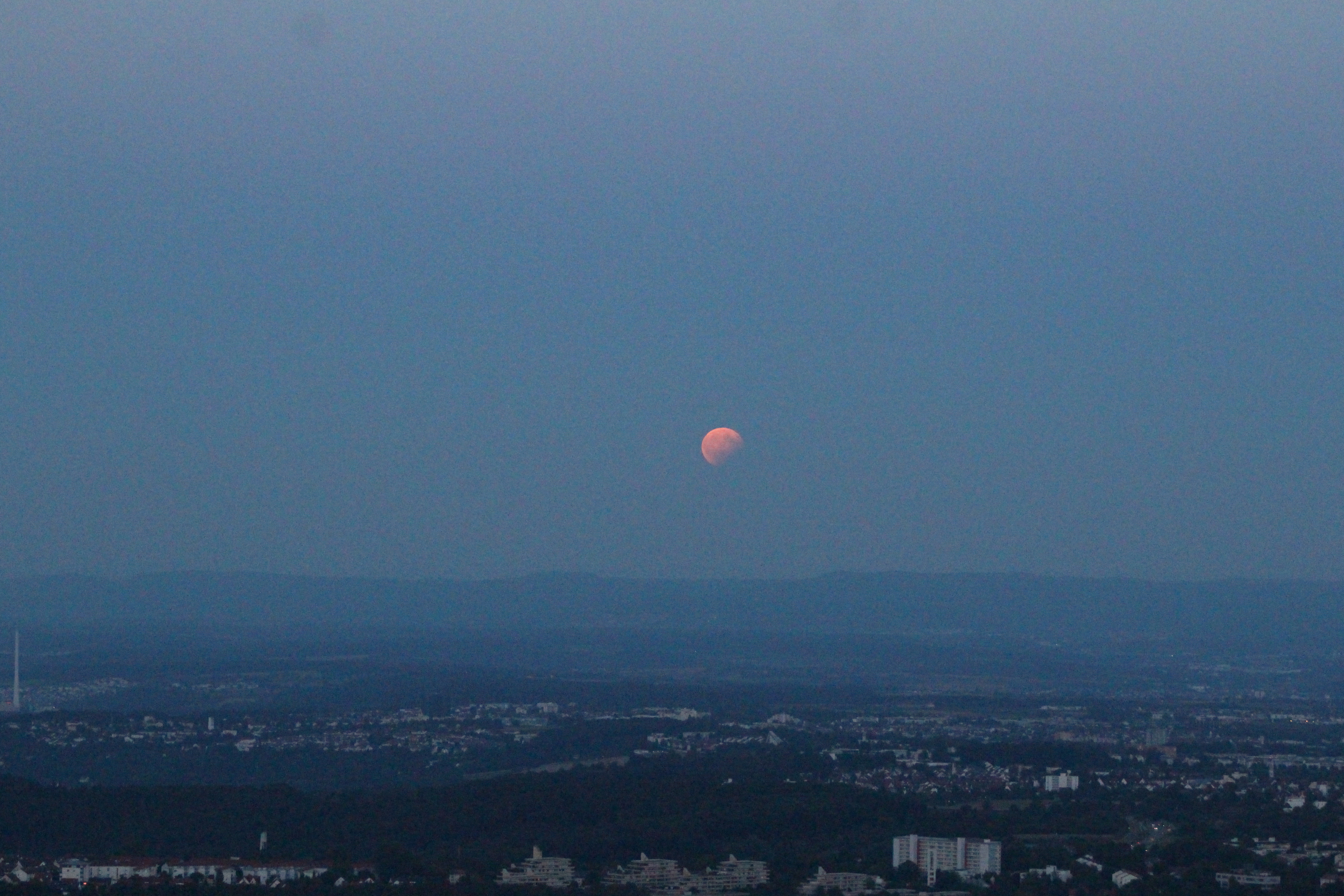 Der partiell verfinsterte Mond am 7. August 2017 über der Schwäbischen Alb und Ostfildern, aufgenommen von der Aussichtsplattform des Stuttgarter Fernsehturms. Am linken Bildrand ist der 250 Meter hohe Schornstein des Kraftwerks Altbach zu sehen.