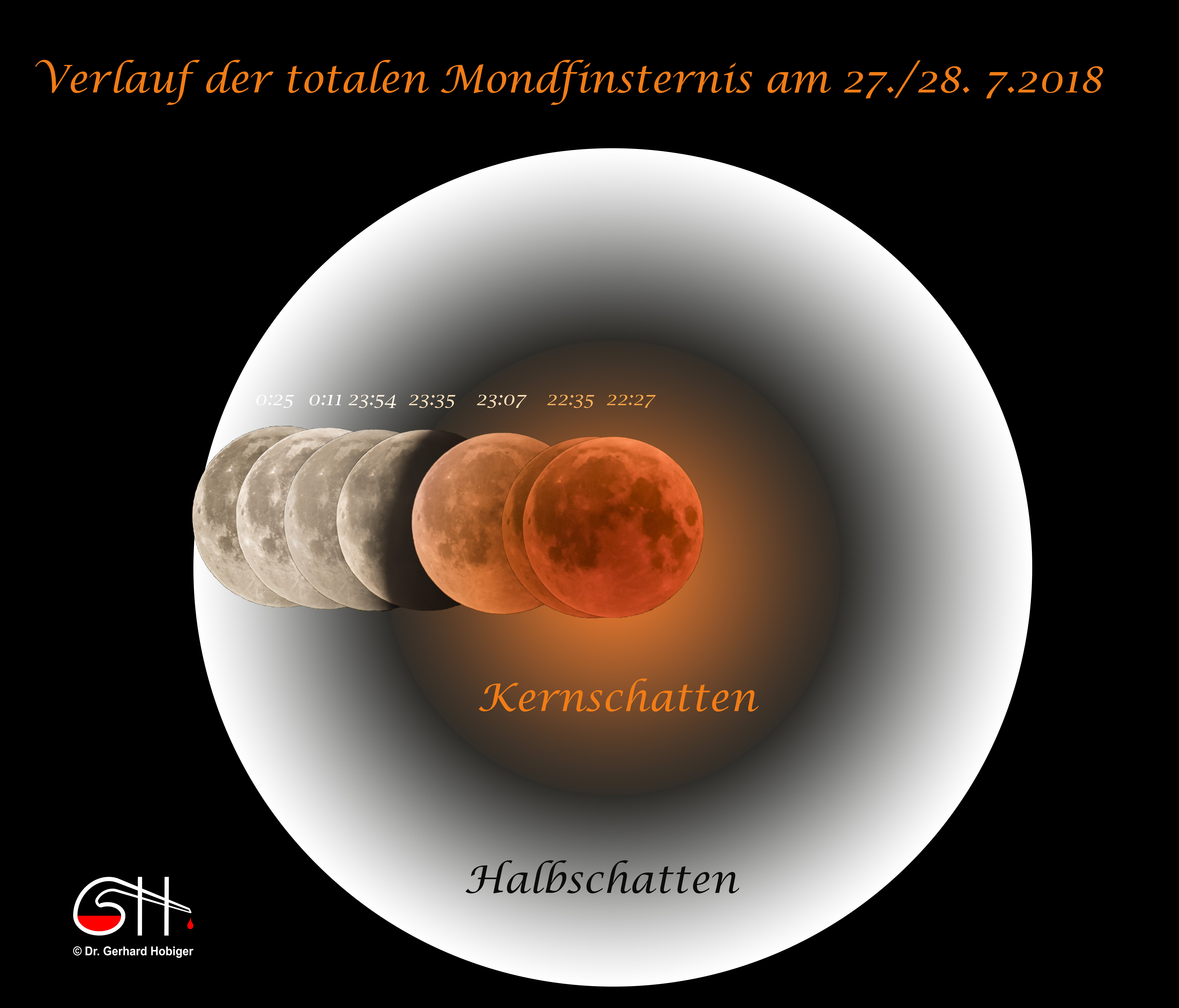 Ich beobachtete die totale Mondfinsternis und hatte eine schöne Zeitreihe. Um zu verdeutlichen, wie der Mond durch die Schattenbereiche der Erde hindurchwandert, legte ich alle Aufnahmen zusammen und zeichnete den Kern- und Halbschatten ein.