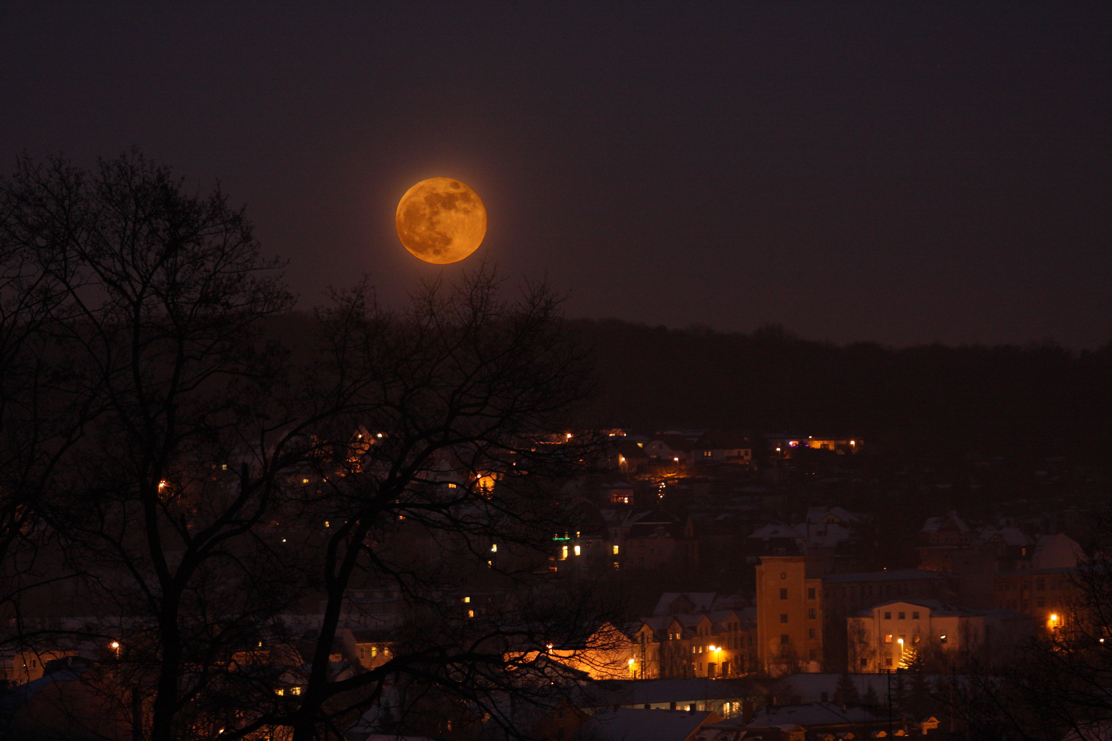 Leserbilder Astronomie: Der Vollmond hängt wie eine Laterne über der abendlichen Stadt
