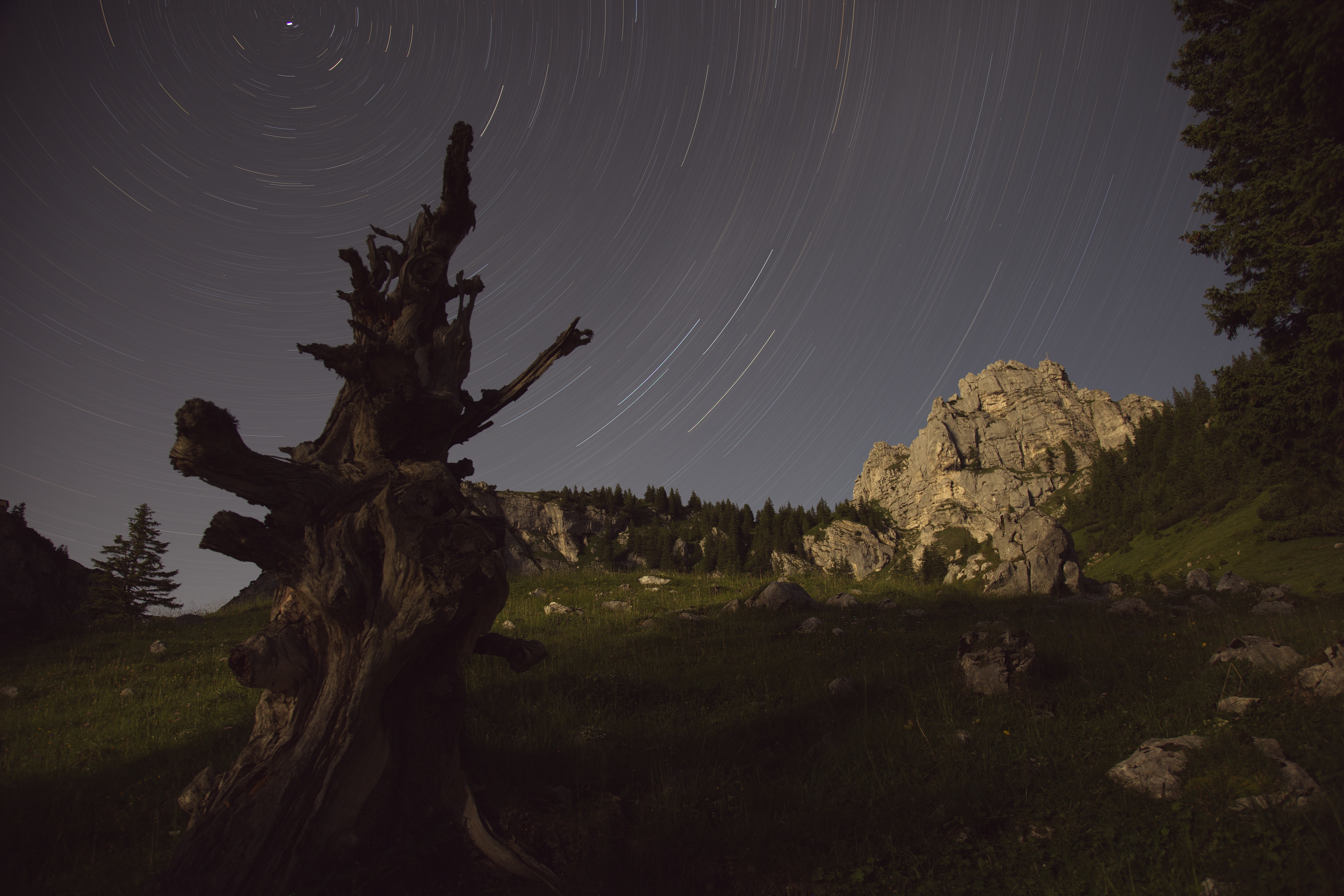 Am 20. Juni 2018 biwakierte ich in den bayerischen Alpen. Ich wollte Sternenbahnen in Verbindung mit der Berglandschaft fotografieren. Dieser alte knorrige Baum war der Ideale Vordergrund dafür. Etwas Licht bekam ich vom untergehenden Mond.