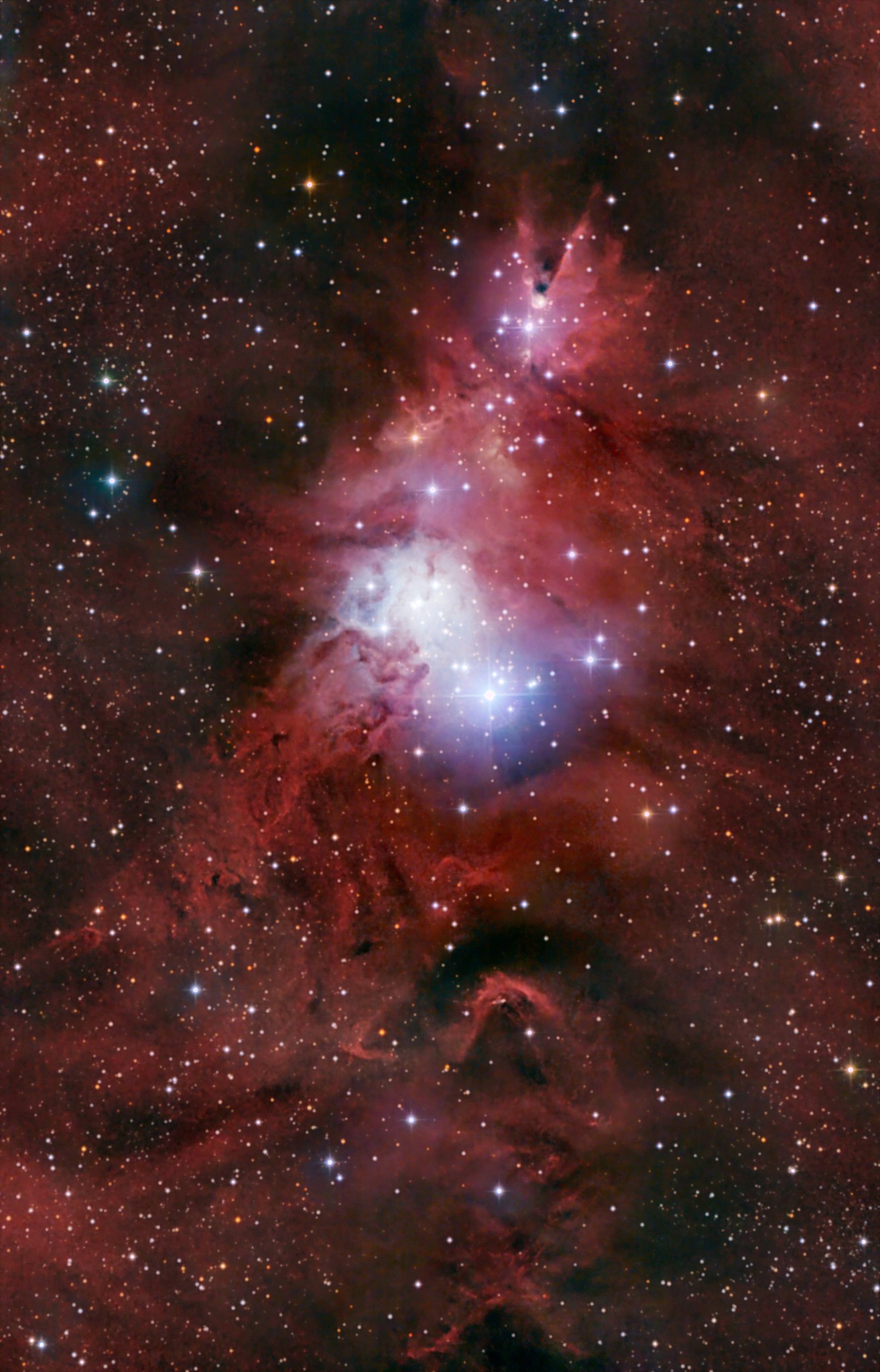 In den letzten Nächten seit Weihnachten, konnte ich den Weihnachtsbaum-Sternhaufen (englisch: Christmastree Cluster) NGC 2264 aufnehmen. Leider lief in einer Nacht meine Montierung nicht, der Motor in der Deklinationsachse hatte hier blockiert, sodass in der einen Nacht nur vier Bilder zusammenkamen. Jetzt sind es 33x H-alpha/OIII und 27x RGB-Daten geworden à 300 Sekunden bei ISO 800 geworden.