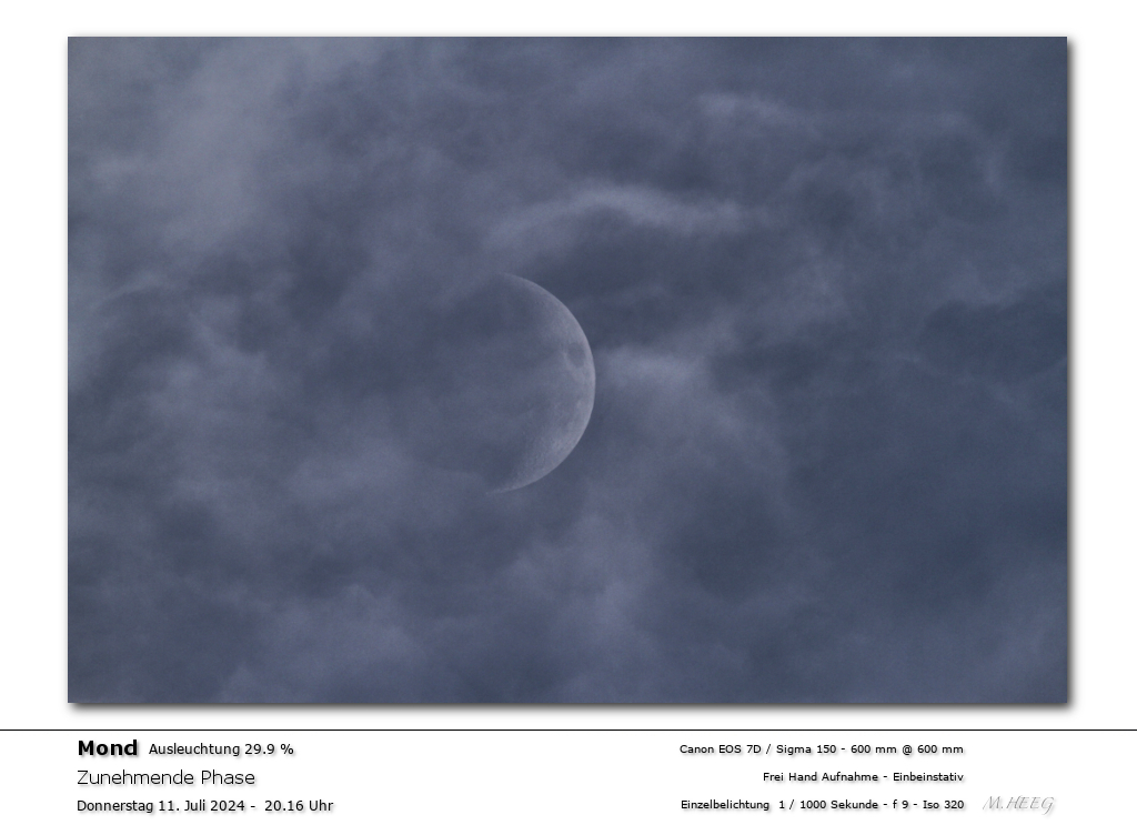 Der Tagesmond in den Wolken. Auch mit einer DSLR und einem Teleobjektiv ist der Mond prima abzulichten. Besonders schön finde ich ihn, wenn er zwischen den Wolken auftaucht. Besonders wie zu sehen am Tag. Viele Grüße an alle sendet Marco Heeg aus Bingen am Rhein