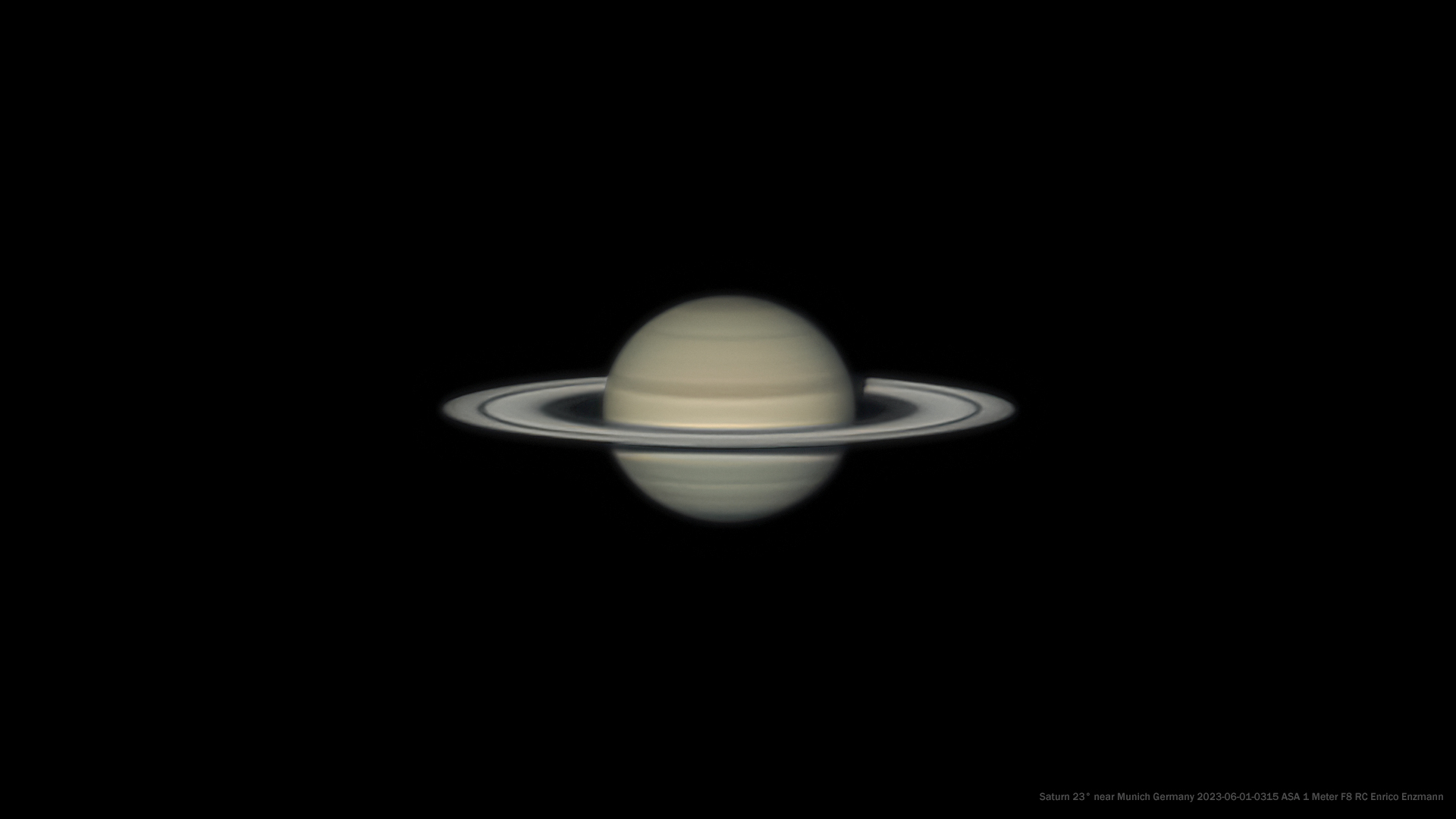Am 1. Juni 2023 hat es sich gelohnt, um 4 Uhr früh aufzustehen. Der Himmel war klar und das Seeing recht gut. So ist diese recht detailreiche Saturnaufnahme entstanden. Zum Ende der mit 40 Minuten recht langen Aufnahmezeit war die Sonne bereits seit 15 Minuten aufgegangen. Trotzdem gelangen noch ein paar Aufnahmen nach dem Sonnenaufgang, die verwertbar waren.