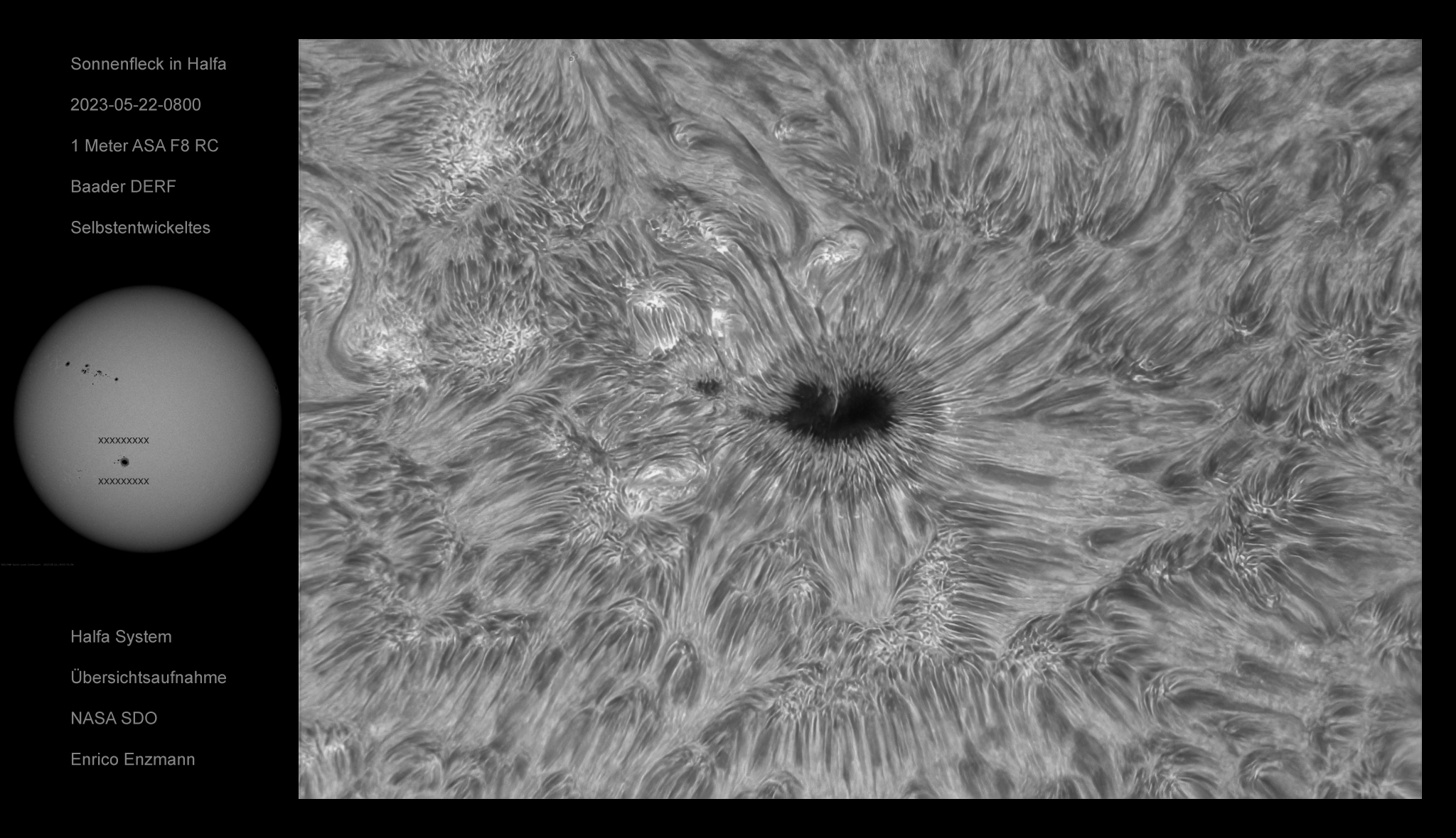 Am 22. Mai war der eigentliche Plan gegen 4 Uhr früh aufzustehen und Saturn das erste Mal in diesem Jahr zu besuchen. Da er bereits in der Dämmerung nur 20° hatte sowie das Seeing nicht besonders gut war, habe ich diesen ersten Versuch abgebrochen. Gegen 10 Uhr Ortszeit wurden die Bedingungen besser, und deswegen habe ich das Teleskop auf H-Alpha umgebaut und diese Aufnahme von dem großen Fleck gemacht. Es sind einige detailreiche Strukturen rund um das Zentrum des Flecks sichtbar.