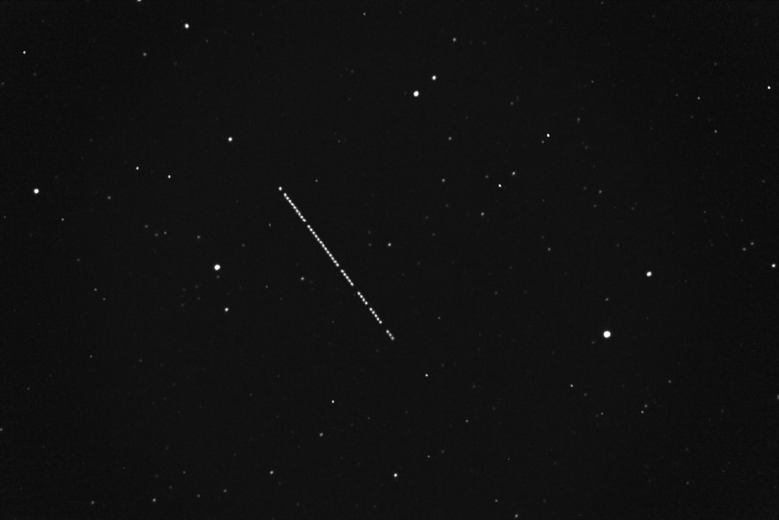 Dichte Annäherung von Asteroid 2024 MK am 29. Juni 2024 von 22:35 bis 22:38 UT – Die Bildaddition zeigt die Bewegung des Asteroiden innerhalb von 3 Minuten! (Abstand etwa drei Sekunden) Die Lücken entstanden durch nicht verwendbare Bilder, auf Grund von starkem Wind.