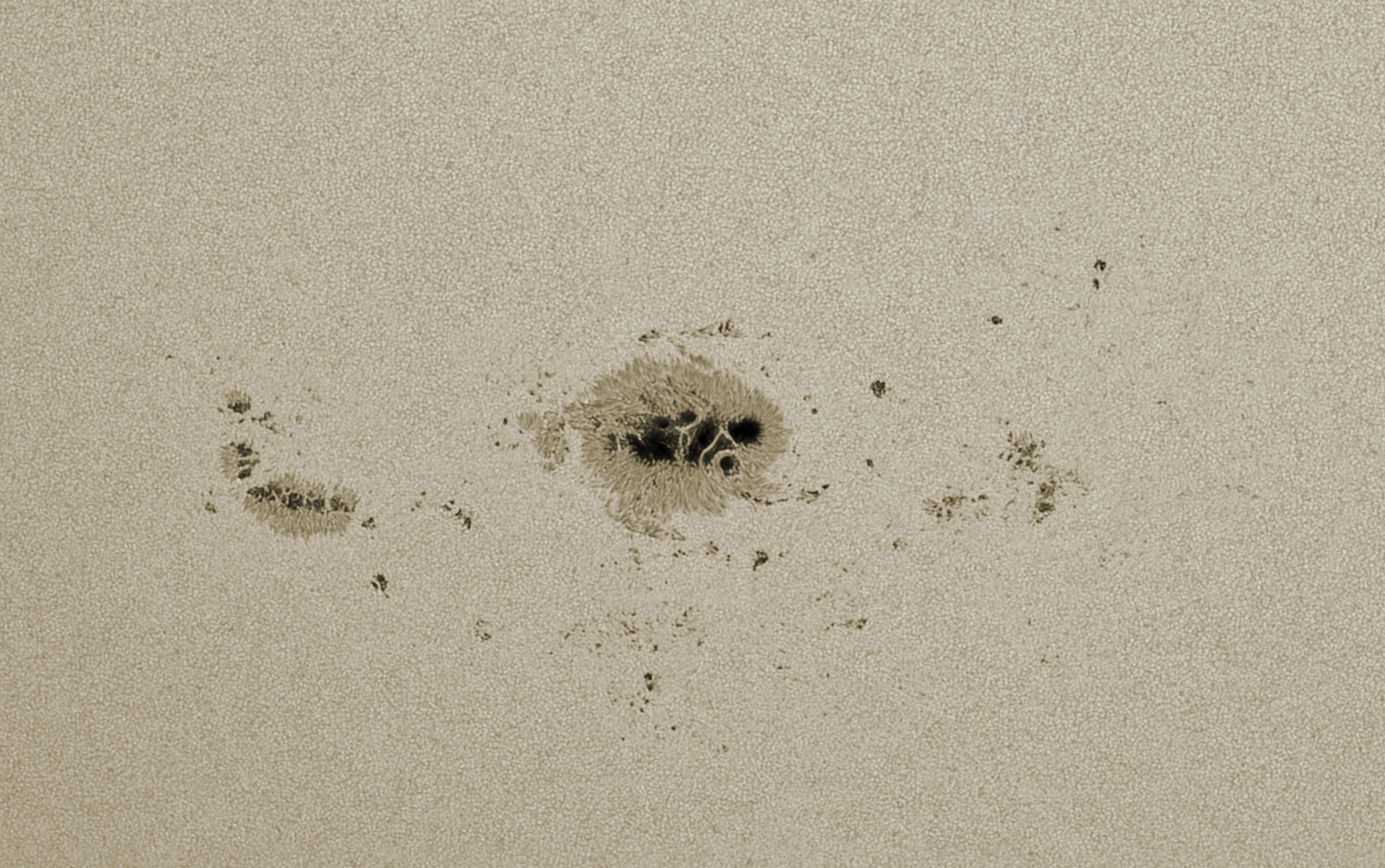 Die aktive Region 3780 mit dem großen Hauptfleck. Die Gruppe befindet sich etwa zehn Grad östlich des Meridians und zeigt sich daher in voller Ausdehnung. Den Hauptfleck konnte ich von bloßem Auge (Schutzglas) problemlos erkennen.