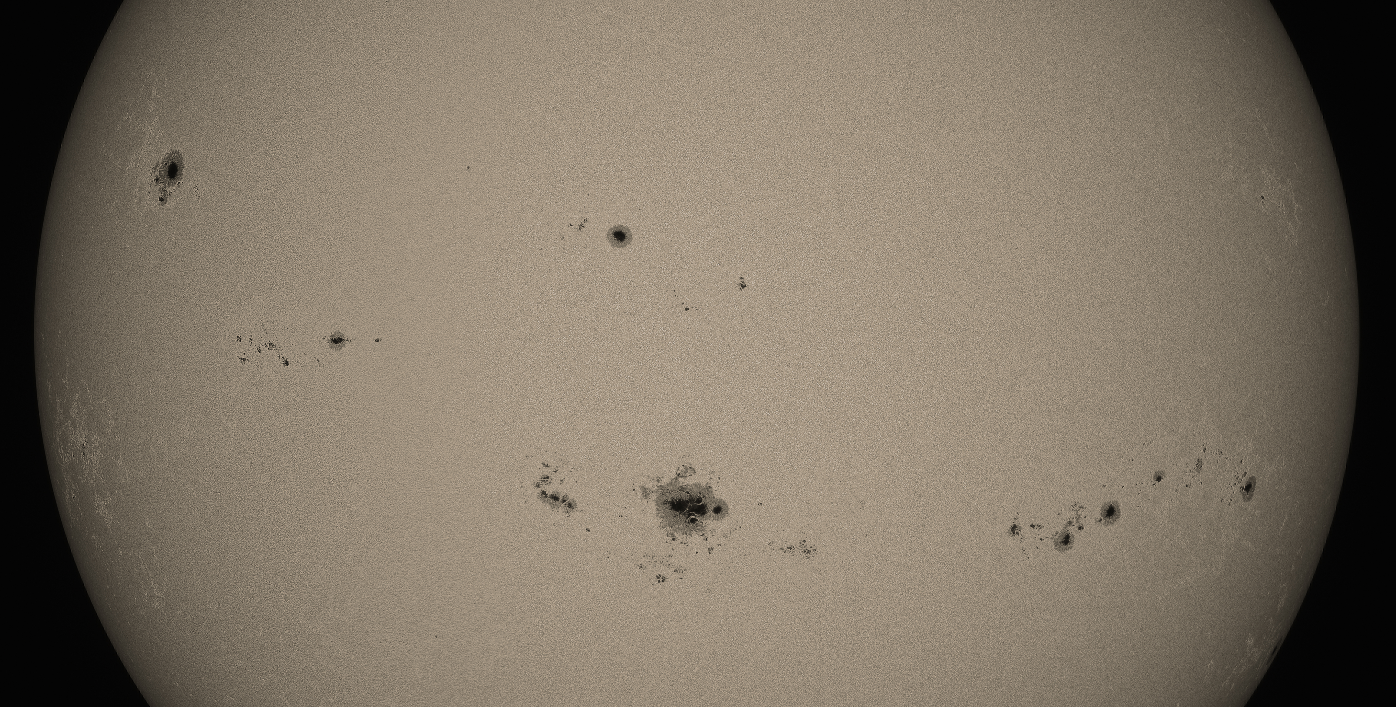 Es war einiges auf der Sonne los an diesem Morgen. Besonders markant in der Bildmitte die Region AR 3780. Der dazugehörige große Fleck war auch gut von bloßem Auge sichtbar. Zur Aufnahme wurde ein Herschelkeil mit Kontinuumfilter 7.5 nm verwendet.