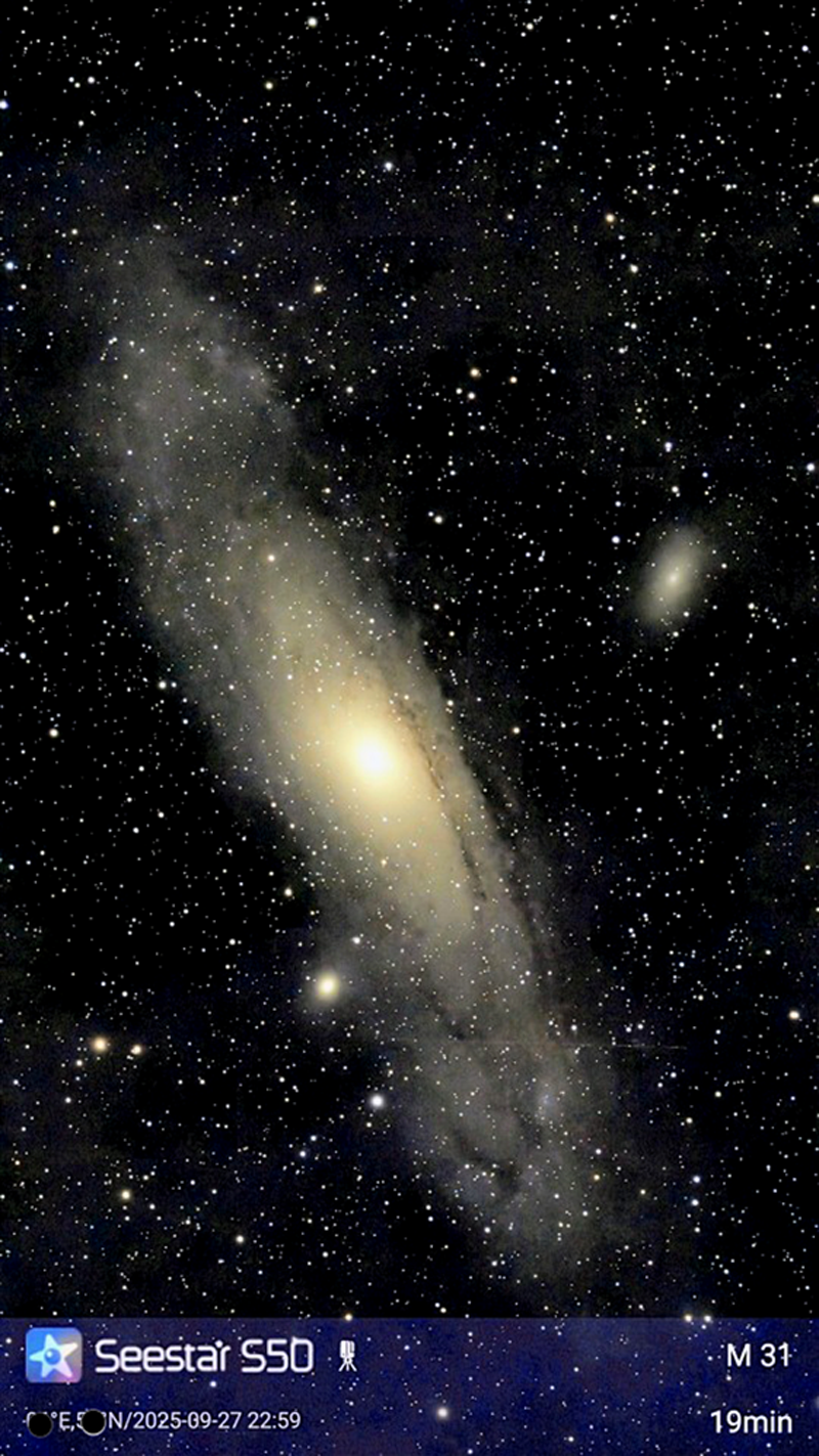 In einer fast klaren Nacht, es war etwas diesig, habe ich mir mit dem Seestar die Galaxie M 31 vorgenommen. Die steht schön hoch und ich habe das Framing-Programm des S 50 eingestellt. Daher kann man tatsächlich die ausgedehnte Galaxie aufnehmen, ohne den Rand stark abzuschneiden. Die im Bild angegebenen 19 Minuten stimmen nicht, ich habe (auch aufgrund des framings) etwas über eine Stunde belichtet. Und dann wollte ich es wissen: Kann man mit einem Handyfotoprogramm eine Bearbeitung des Bildes machen, die ein akzeptables Ergebnis bringt? Mit F-Stop habe ich dann nach Bluetoothübertragung auf mein Handy das Bild aufgebessert. Das Ergebnis seht ihr hier. Ich würde sagen: Man kann :-) Tatsächlich hat mich das Ergebnis erstaunt. Fazit: Es ist nicht schwer eine schöne Aufnahme inklusive Aufbesserung zu erreichen. Die Besonderheit: Dieses Gerät ist für Menschen mit Handicap, also auch Rollstuhlfahrer geeignet. Menschen, die eine normale Sternwarte aufgrund der baulichen Gegebenheiten nicht besuchen können, erleben hier die Faszination des Weltalls selber live. Auch für Laien umsetzbar. (Danke Herr Kloss von den Teleskop-Spezialisten für die Bereitstellung des S 50!) Jeder beurteile es anhand des Fotos selbst!