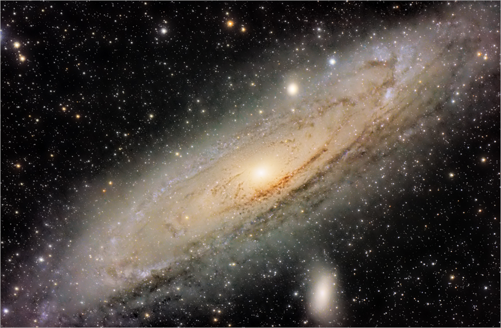 Die Andromedagalaxie M 31 ist 2,5 Millionen Lichtjahre entfernt. Der Durchmesser der sichtbaren Scheibe beträgt etwa 140 000 Lichtjahre. Die nächstkleineren Begleiter der Lokalen Gruppe, M 32 und M 110, sind ebenfalls auf dem Foto sichtbar.