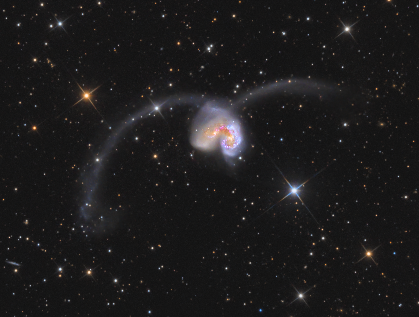 Die Antennen-Galaxien sind das berühmte interagierende Paar im Raben, in 66 Millionen Lichtjahren Entfernung. Trotz der Entfernung sind sie recht hell, und bereits in kleinen Teleskopen sichtbar (auch bei uns, Sicht nach Süden vorausgesetzt)! In der Fotografie offenbaren Sie die schönen Details in ihren Herzen, und die beiden Gezwitenschweife, denen sie ihren Namen verdanken. https://www.astrobin.com/43r7wv/
