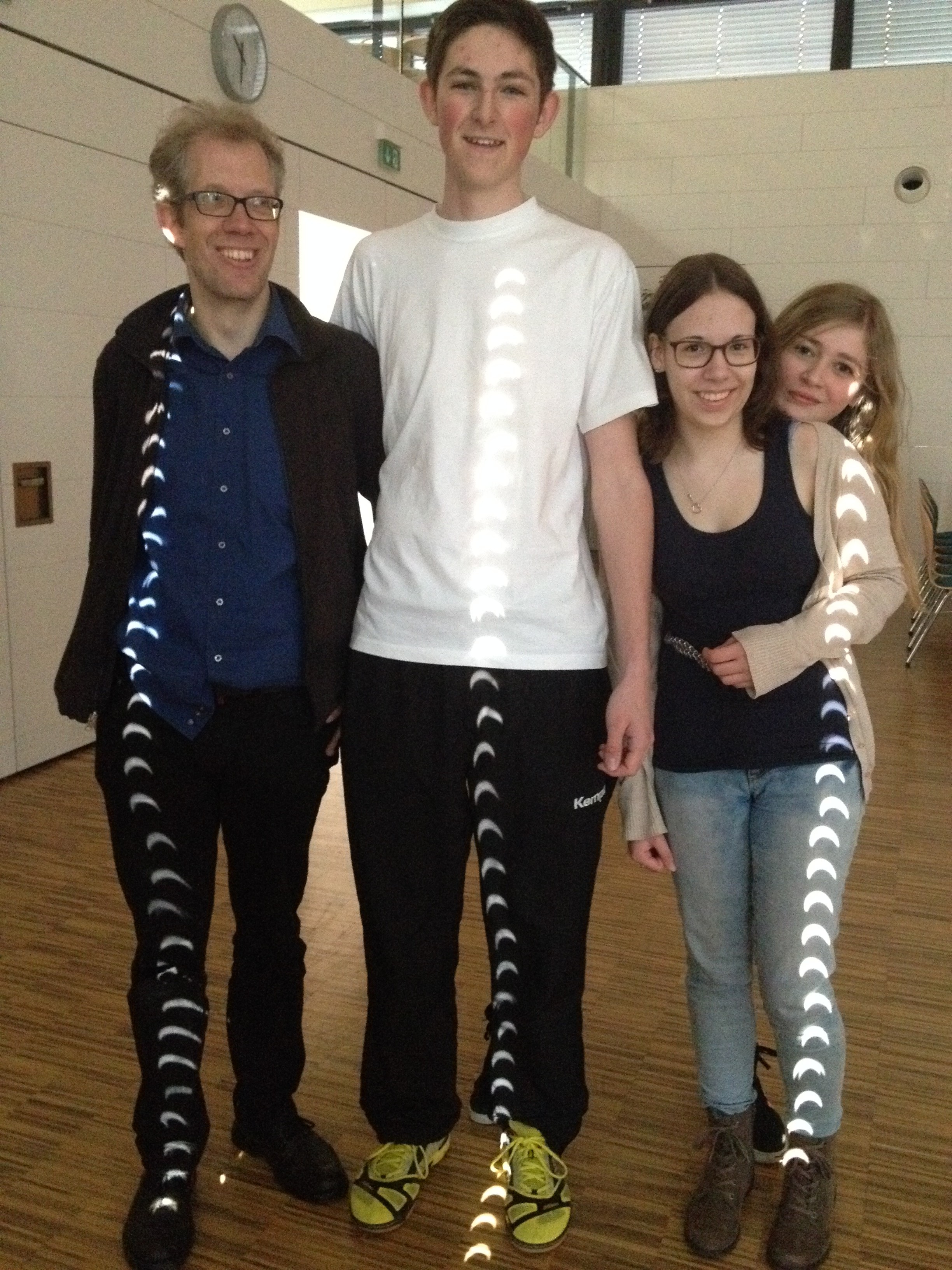 Die einfachsten Beobachtungen sind oft die schönsten. Nachdem wir am Progymnasium Rosenfeld die Festhalle abgedunkelt hatten, war der Boden überzogen mit Sonnenabbildungen. Jede Öffnung in der Jalousie ist eine kleine Lochkamera. Eine Animation gibt es unter: