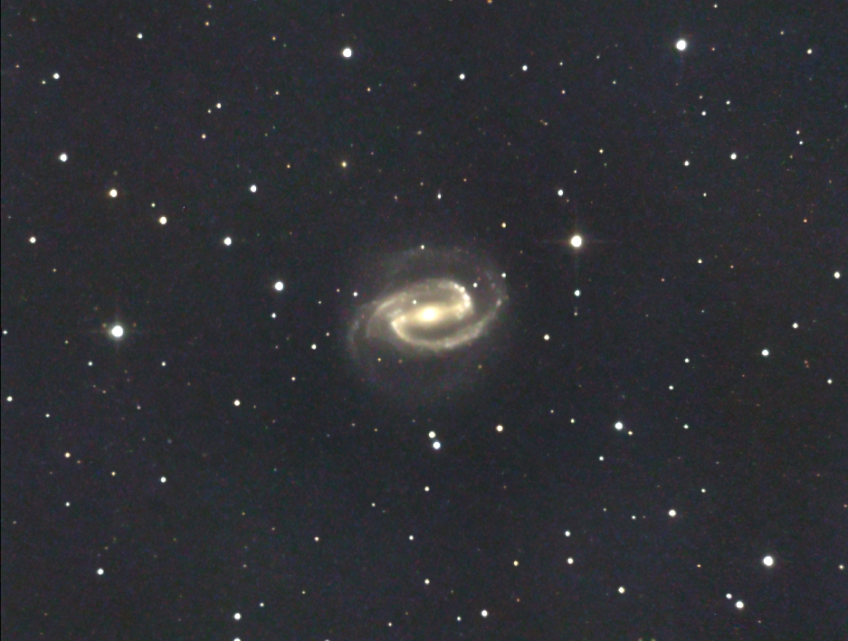 Immer wieder versuche ich, meine alte Aufnahme von der schönen Balkenspirale NGC1300 zu verbessern. Bei nur -19,5 Grad Deklination steht sie hier nur 21 Grad hoch im Meridian und noch niedriger, wenn man drei Stunden Frames in einer Sitzung gewinnen will. Tief im Südosten taucht sie dann im Dunst und stark durch Extinktion und mageres Seeing beeinträchtigt auf. Es sollte auch der Mond dann das Weite gesucht haben und auch gerade ein Hochdruckgebiet ohne Hochnebelbildung vorherrschen. All das ist aber sehr selten! Obwohl ihre scheinbare Helligkeit 10,3 mag beträgt, kann diese durch Wetterverhältnisse (ohne Wolken) bis 3 mag schwächer erscheinen. Auch der Anteil des reduzierten Blauanteils im Spektrum durch Streuung bewirkt eine gelbliche Färbung. Am hellen Bulge sitzt ein ausgeprägter Balken, von dem symmetrisch zwei Spiralarme ansetzen, die sich fast zweimal, immer diffuser werdend, um das Zentrum winden. Auf dem Balken und entlang der Spiralarme befinden sich unzählige blaue Starburst-Regionen. Vom Hubble Typ SBbc beträgt ihre Größe 150000 Lichtjahre in 65 Millionen Lichtjahren Entfernung. Entdeckt wurde diese bemerkenswerte Galaxie von John Herschel am 11.Dezember 1835. Ein eindrucksvolles Bild stammt vom Hubble Space Telescope. Aufnahmen von 2912, 2917 und 2924 ergaben insgesamt fast zehn Stunden an Belichtungszeit.