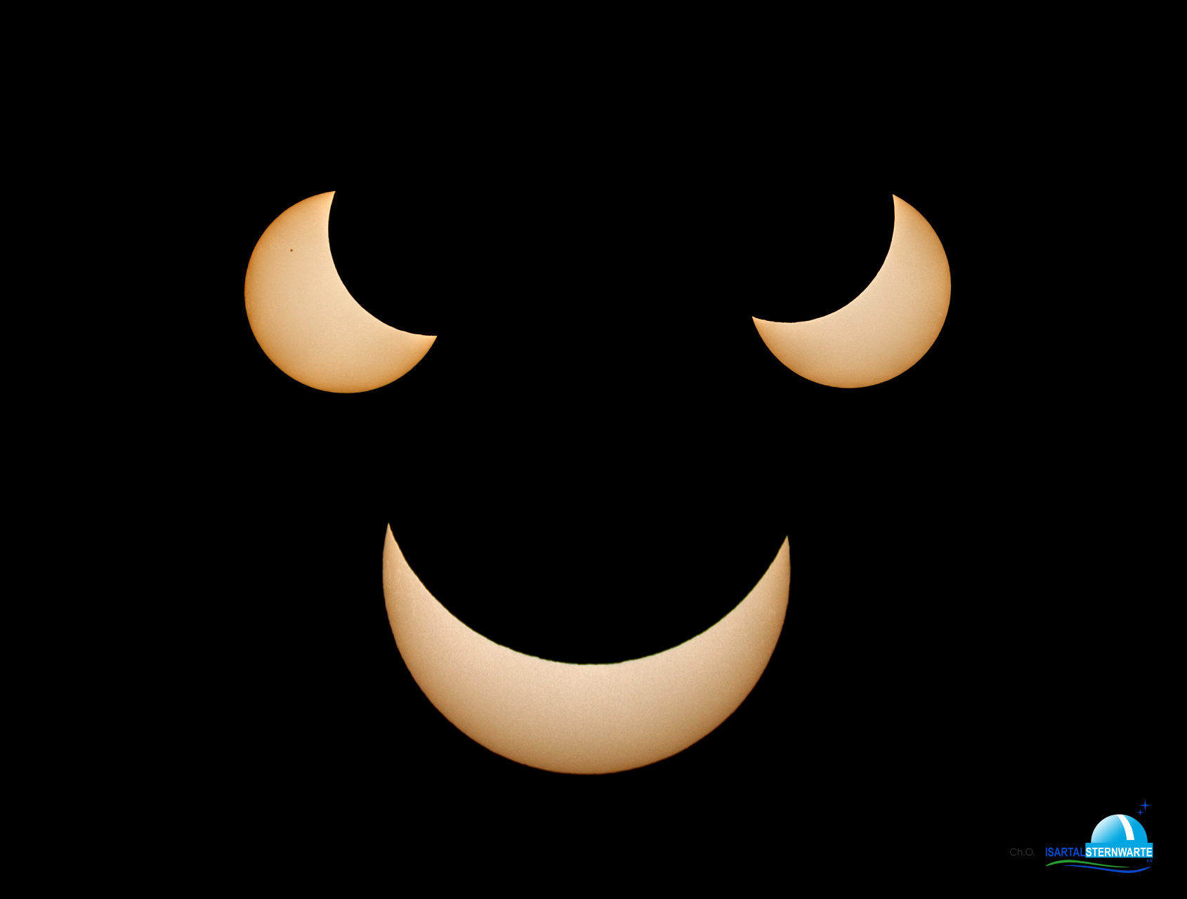Sicherlich ist bei der Sonnenbeobachtung höchste Achtsamkeit geboten, aber bei den ganzen Warnmeldungen (eventuelle Stromausfälle: "benutzen Sie ja nicht den Aufzug während der SoFi", ganze Schulen wurden in Bayern eingeschlossen, damit keiner der Schüler nicht doch irgendwo ohne Filter in die Sonne schaut), muss ich mich teilweise wirklich fragen wie wir die SoFi 1999 massenhaft unbeschadet überlebt haben. Die etwas "grimmig" dreinblickende SoFi-Collage besteht aus drei Aufnahmen die von der Terrasse der neuen Isartalsternwarte e.V. aus aufgenommen wurden (oben links auf dem halben Weg zum und oben rechts auf dem halben Weg nach dem Maximum, unten zum Maximum).