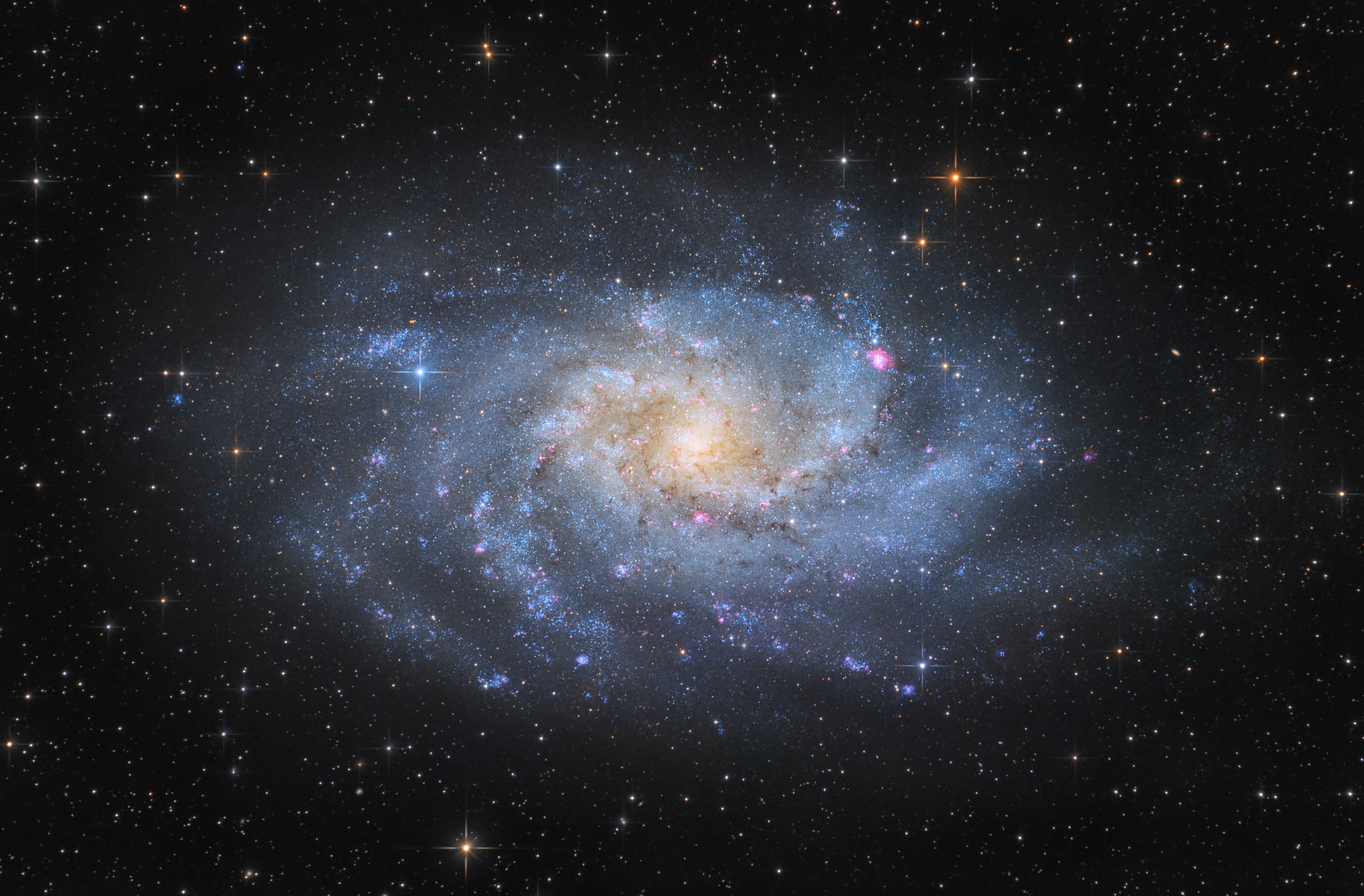 Die Dreiecksgalaxie kann mit einer Größe von 70 Bogenminuten mal 40 Bogenminuten fast formatfüllend mit meinem 10-Zoll-Newton-Teleskop und der Nikon D5300 abgelichtet werden. Sie ist die drittgrößte Galaxie in der lokalen Gruppe, aber mit zirka 50 000 Lichtjahren doch schon erheblich kleiner als die Milchstraße bzw. die Andromedagalaxie.