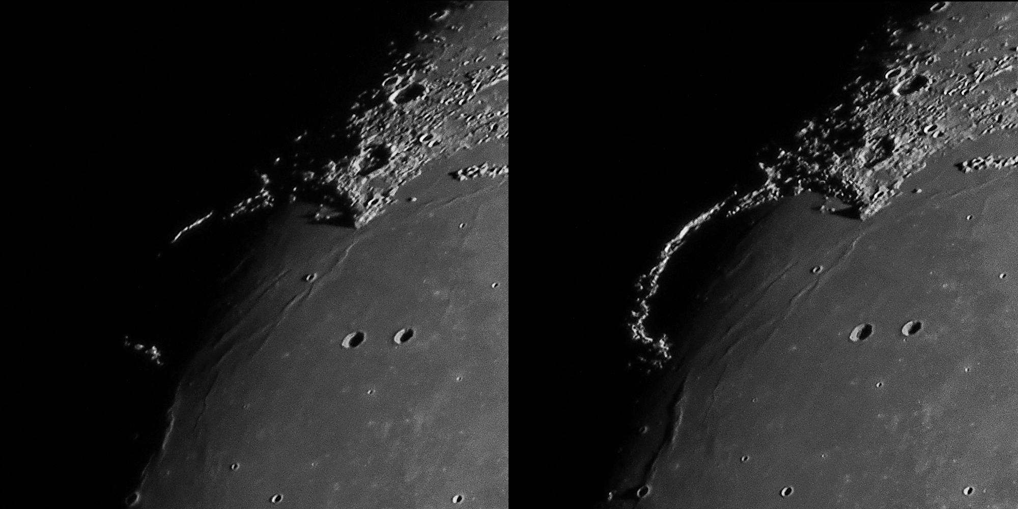 Viele Hobbyastronomen beobachten gerne den Goldenen Henkel. Dieser ist eigentlich der beleuchtete Gebirgszug Montes Jura, welcher das Sinus Iridum umrahmt. Linke Aufnahme um 19:04 Uhr und rechte Aufnahme um 22:20 Uhr MEZ.