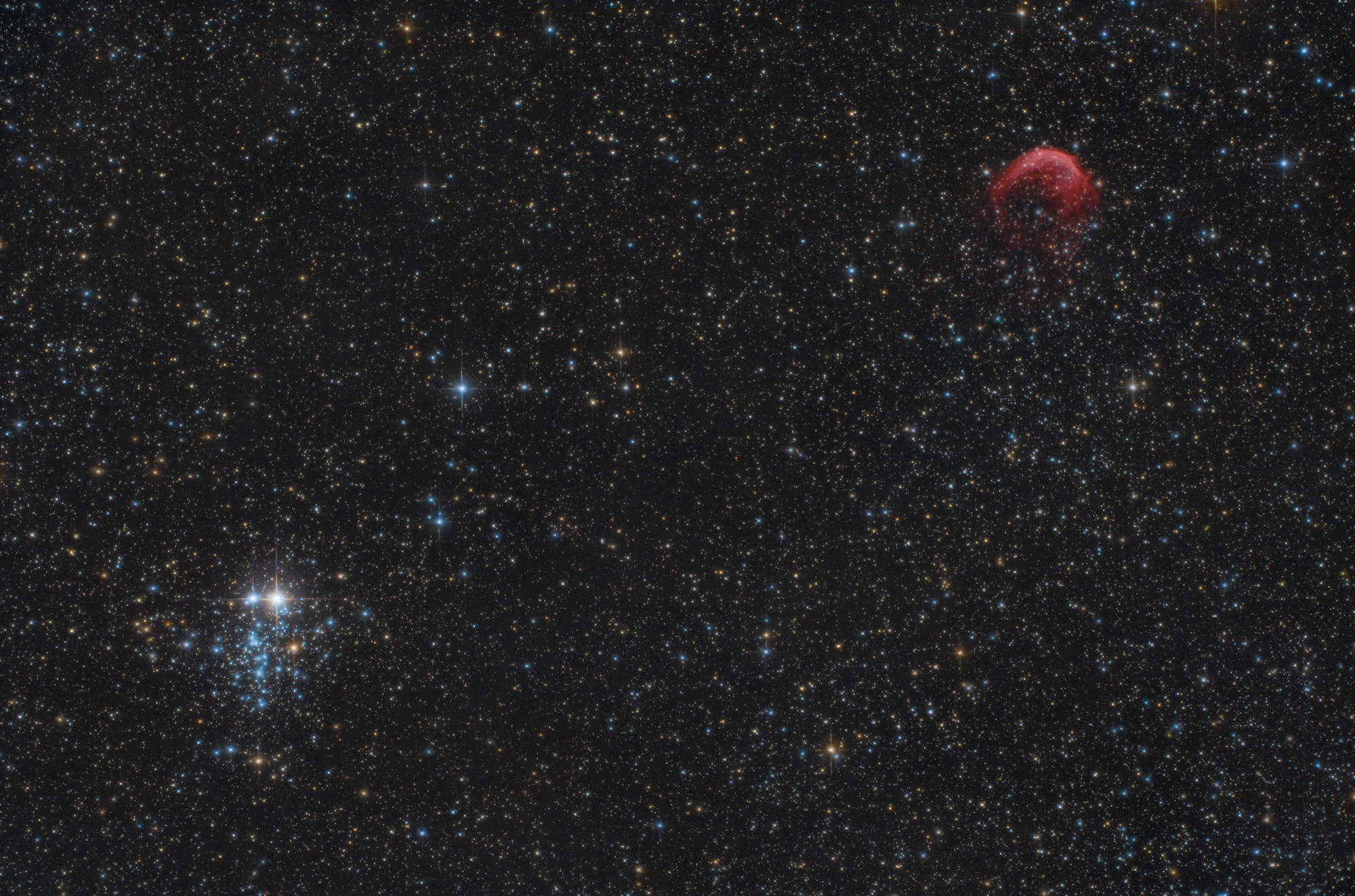 Der Eulenhaufen NGC 457 und der Delfinnebel SH2-188 im Sternbild Kassiopeia sind wirklich nettes Paar im kosmischen Zoo.