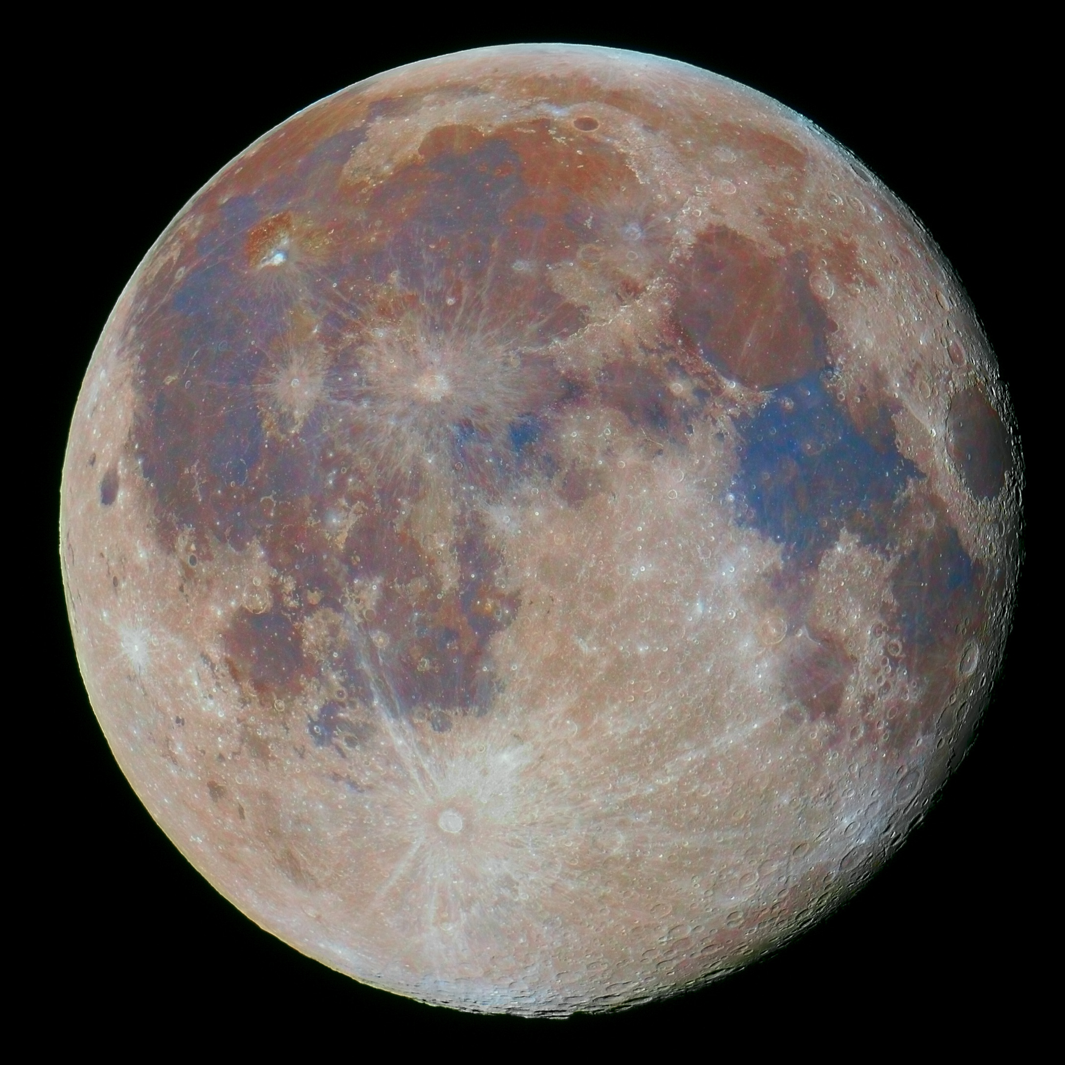 Schon länger hatte ich den Wunsch, die Farben des Mondes einmal selbst im Bild festzuhalten. Immerhin erzählen sie uns viel über seine Geschichte und seine Zusammenstetzung. Das vorliegende Bild wurde aus einer RAW-Datei entwickelt, in der Bildbearbeitung dann in den Modus Lab konvertiert und dort die Farb- und der Luminanzkanal separat speziell bearbeitet. Anschließend erfolgte noch eine Kontraststeigerung und die Rückkonvertierung zu RGB.