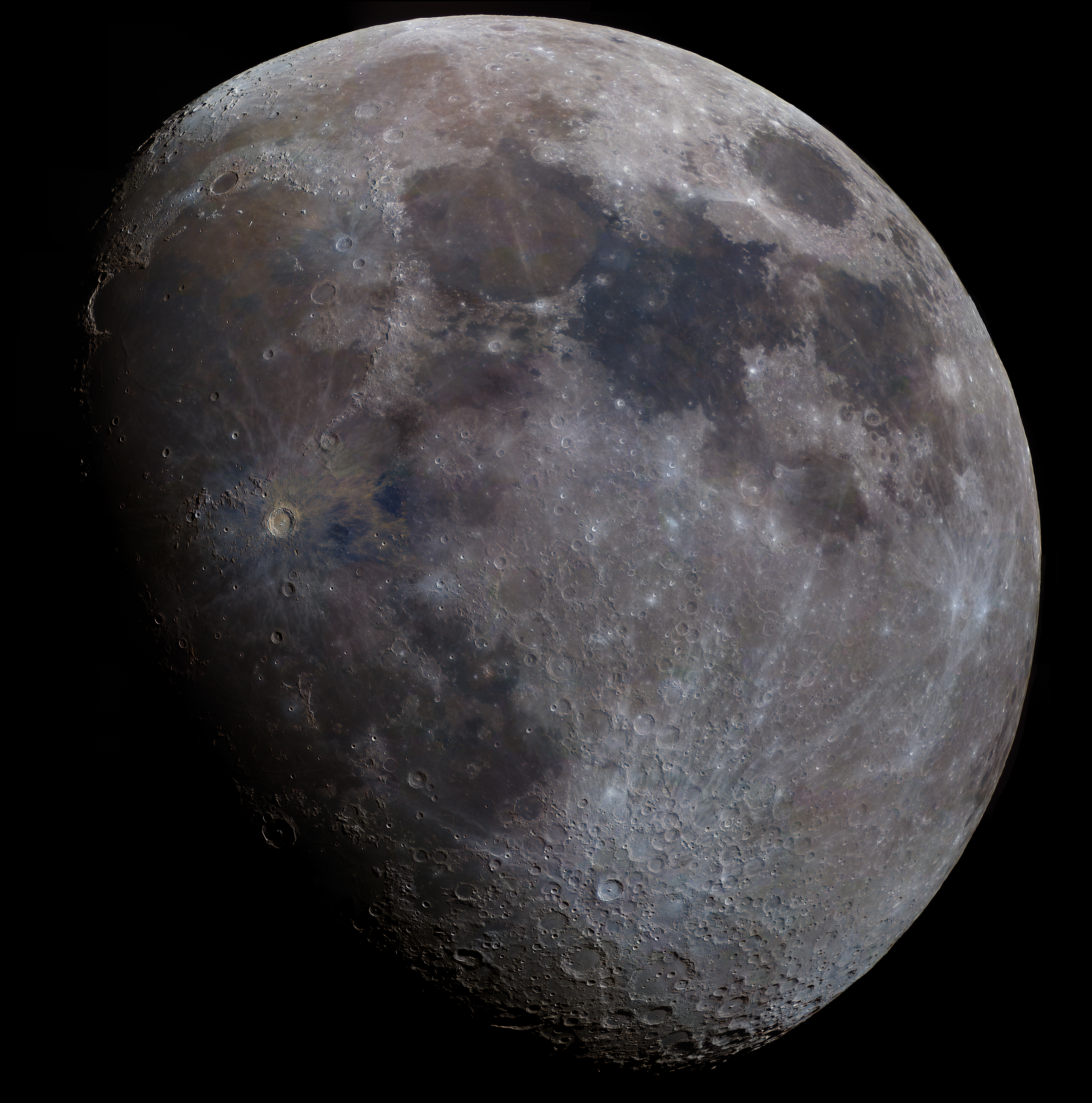 Der Mond am 13. März 2022 mit einer farbverstärkten Bearbeitung, um die unterschiedlichen Färbungen besser darzustellen. Farbmosaik aus mehr als 50 Einzelbildern.