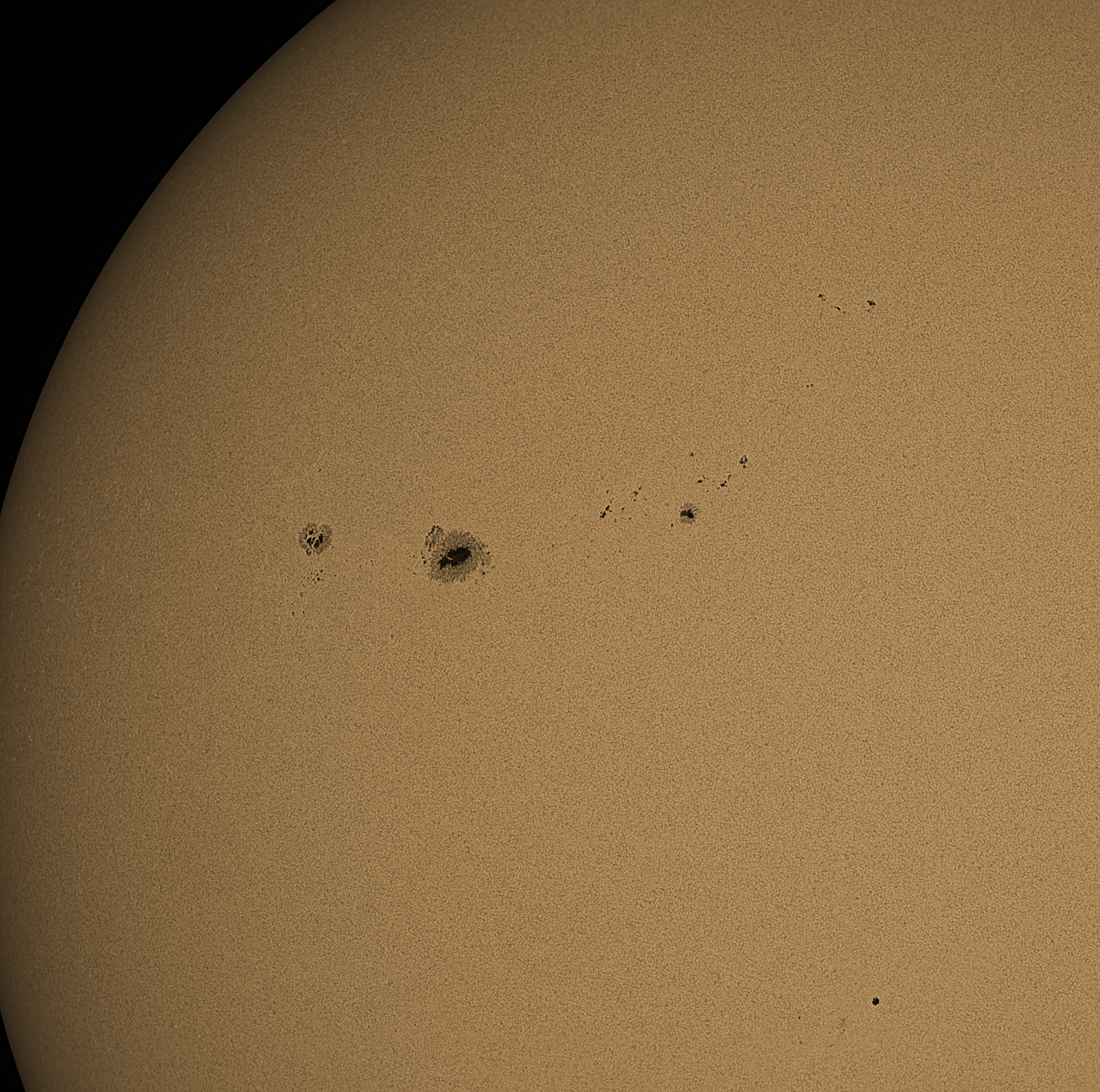 Die östliche Hälfte der Sonne zeigt am frühen Morgen mehrere Gruppen von Sonnenflecken.