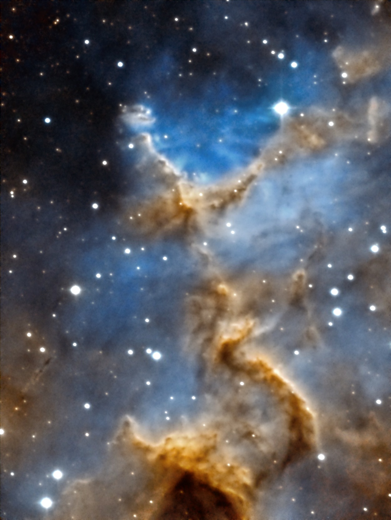 Nahe dem Zentrum des 7500Lj. entfernten IC1805 stehen die O-Sterne des jungen Sternhaufens Melotte 15. Ihre UV-Strahlung regt das umliegende Gas zum Leuchten an. Interessant ist insbesondere die Verteilung des blau leuchtenden Sauerstoffs OIII in der hoch angeregten Zone der Gabelbucht. Hier wechselwirken anscheinend Zonen mit starken Sternwinden, Schockfronten leuchten hell auf.