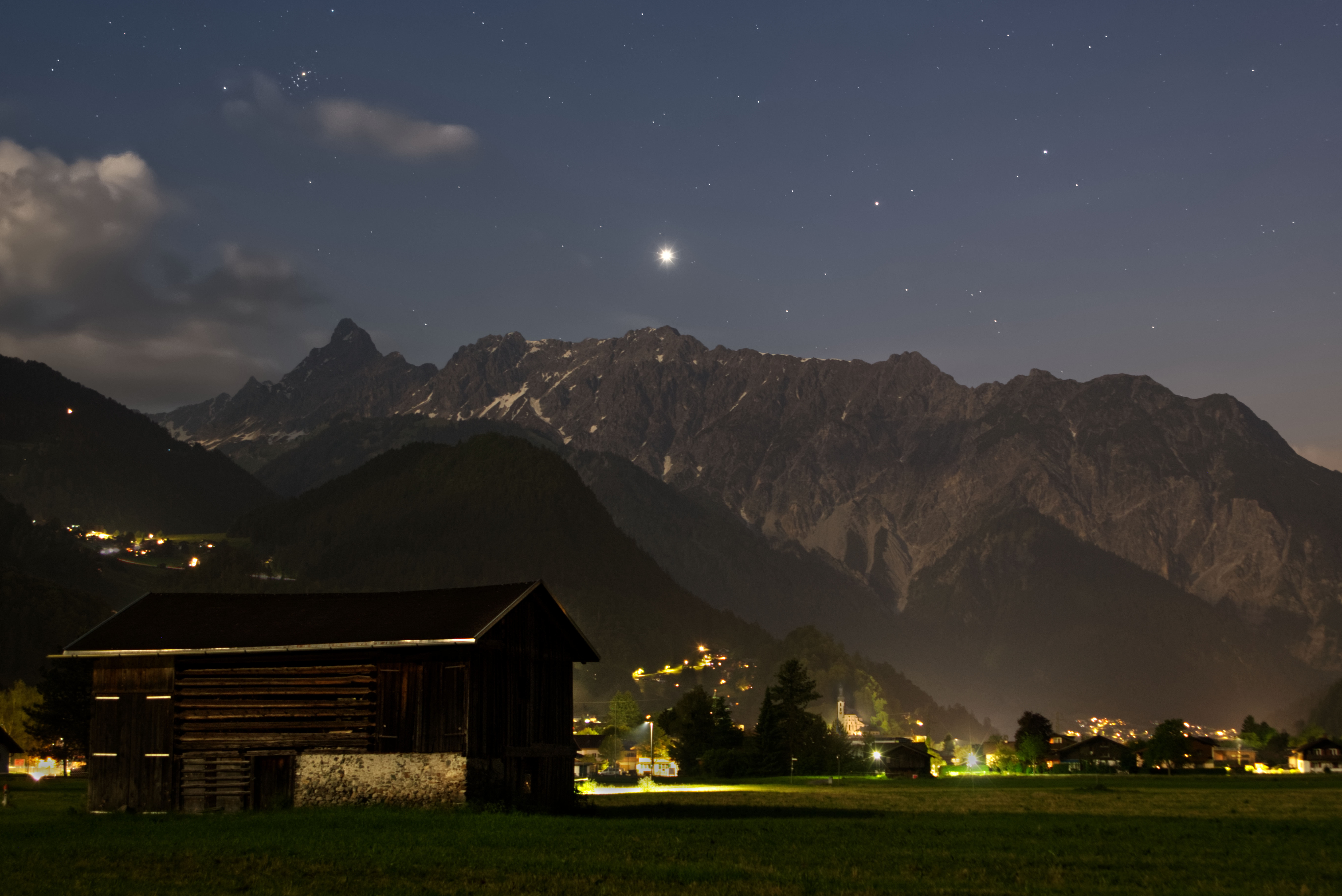 Am Abend des 2.Juni 2023, ein Tag vor Vollmond, bildeten die strahlende Venus und die beiden Zwillingssterne Pollux und Castor nahezu eine Linie über dem Westhorizont. Dazu gesellte sich der rötliche, mittlerweile ziemlich unscheinbare Mars. Dieser stand an jenem Abend ziemlich genau in mitten des offenen Sternhaufens M 44, auch bekannt als die Krippe oder Praesepe. Ein Urlaub im österreichischen Montafon machte diese Aufnahme möglich. Als Motiv dient das Bergmassiv der Vandanser Steinwand mit der 2643 Meter hohen Zimba. Ganz links die markante Mittagsspitze mit 2168 Metern. Im Vordergrund die Laternen der Gemeinde Tschagguns. Sanft leuchtet der fast volle Mond die Landschaft aus.