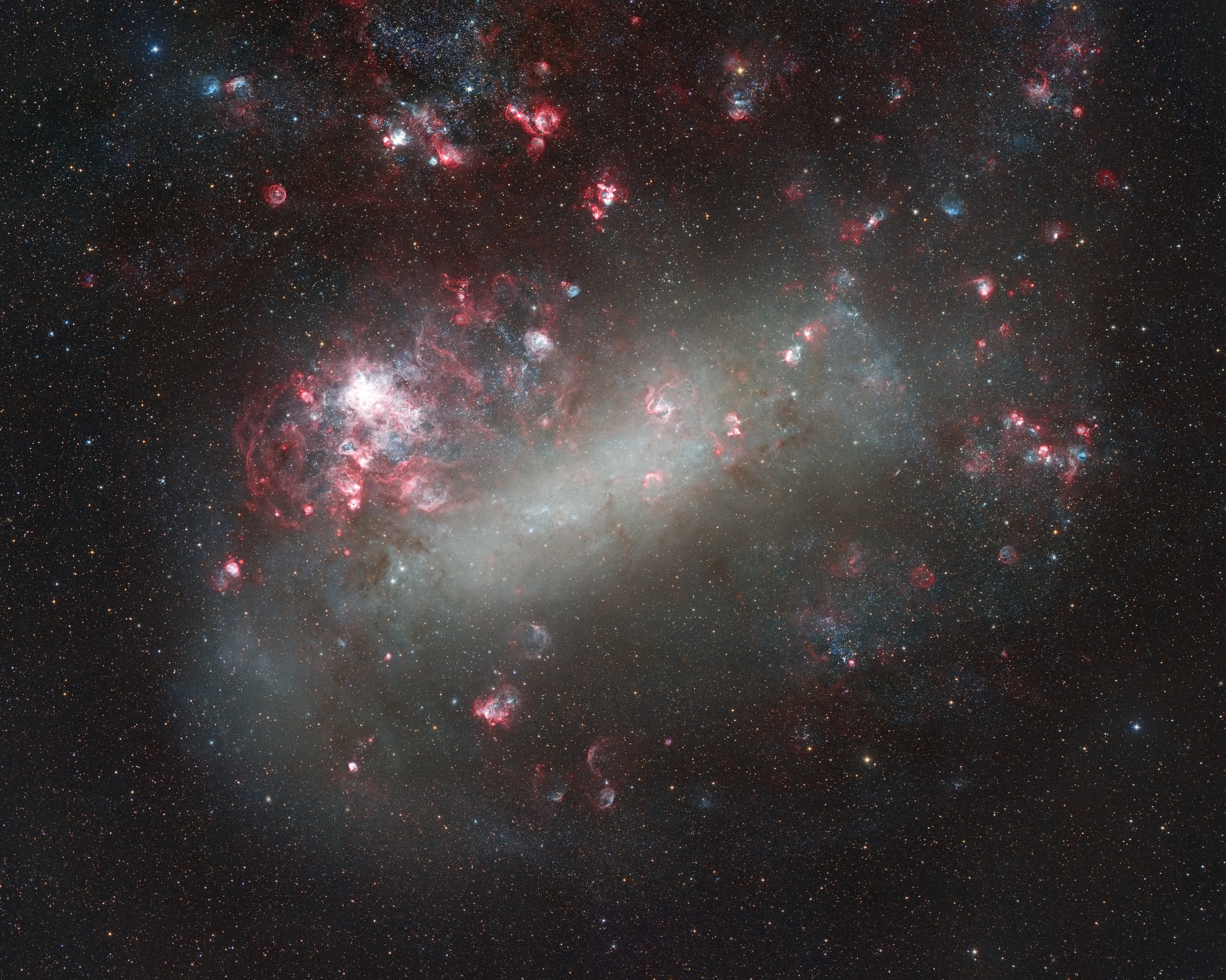 Die Große Magellansche Wolke (LMC) ist etwa 160000 Lichtjahre von der Milchstraße entfernt und Teil der Lokalen Gruppe. Sie befindet sich relativ tief am Südhimmel im Sternbild Dorado (Schwertfisch) und ist daher von Chile aus gut zu beobachten. Mit einer Ausdehnung von 14000 Lichtjahren handelt es sich um eine eher kleine Galaxie. Aufgrund ihres Aussehens zählt die LMC zu den irregulären Zwerggalaxien. Die unregelmäßige Form und der zentrale Balken deuten darauf hin, dass Gezeitenwechselwirkungen mit der Milchstraße und der Kleinen Magellanschen Wolke (SMC) die LMC von einer klassischen Balkenspirale zu ihrem aktuellen, chaotischeren Aussehen verzerrt haben.