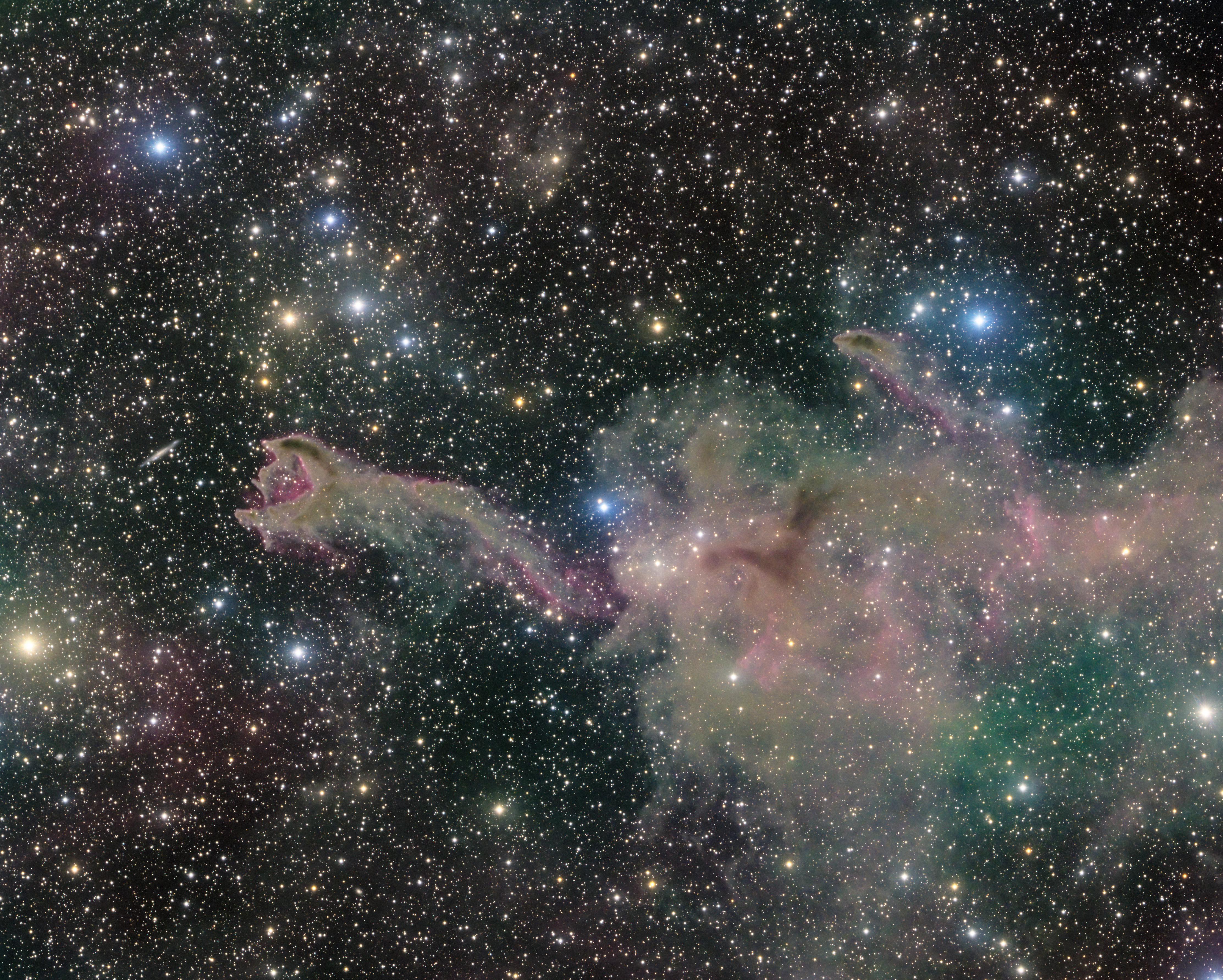 Die Hand Gottes gibt es nicht nur bei einem Tor bei derm WM 1986 (Maradonna), sondern auch am Himmel. Die Cometary Globule 4 ähnelt wirklich einer gigantischen Hand, die nach der Galaxie PGC 21338 (ESO 257-19) greift. Das westliche Nebelgebiet ist Sa101.