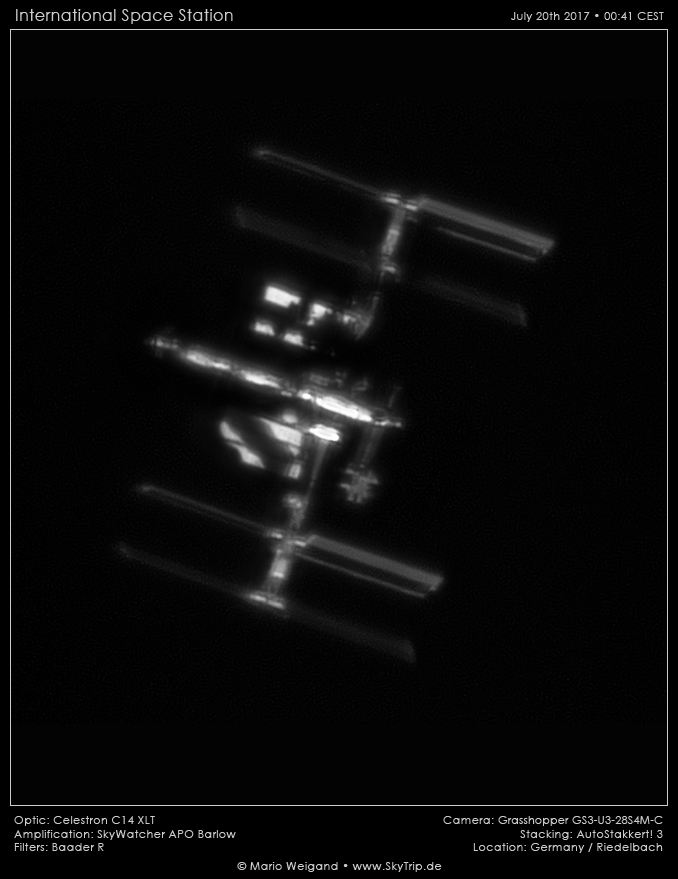 Bei dieser Passage war die ISS während der Kulmination quasi wie aus der Vogelperspektive zu sehen. Man blickt optimal auf die zentrale Anordnung aus den russischen und amerikanischen Modulen. Auch JEM mit der externen Experimentierplattform ist optimal zu sehen. Nur Columbus ist fast vollständig im Schatten. Die Radiatoren werden von den Schatten verschiedener Module getroffen und sind daher etwas schwerer zu erkennen. Eine Beschriftung einiger Details gibt es hier: