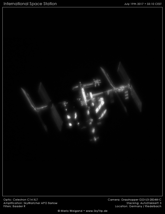 Die ISS bei einem Überflug am 19. Juli 2018. Der zentrale Hauptstrang aus amerikanischen und russischen Modulen wird teilweise durch die Schatten der Radiatoren und Solarmodule verdunkelt. Zumindest das europäische Columbus-Modul und das japanische JEM sind optimal zu sehen. Eine Beschriftung einiger Details gibt es hier: http://www.skytrip.de/iss26.htm