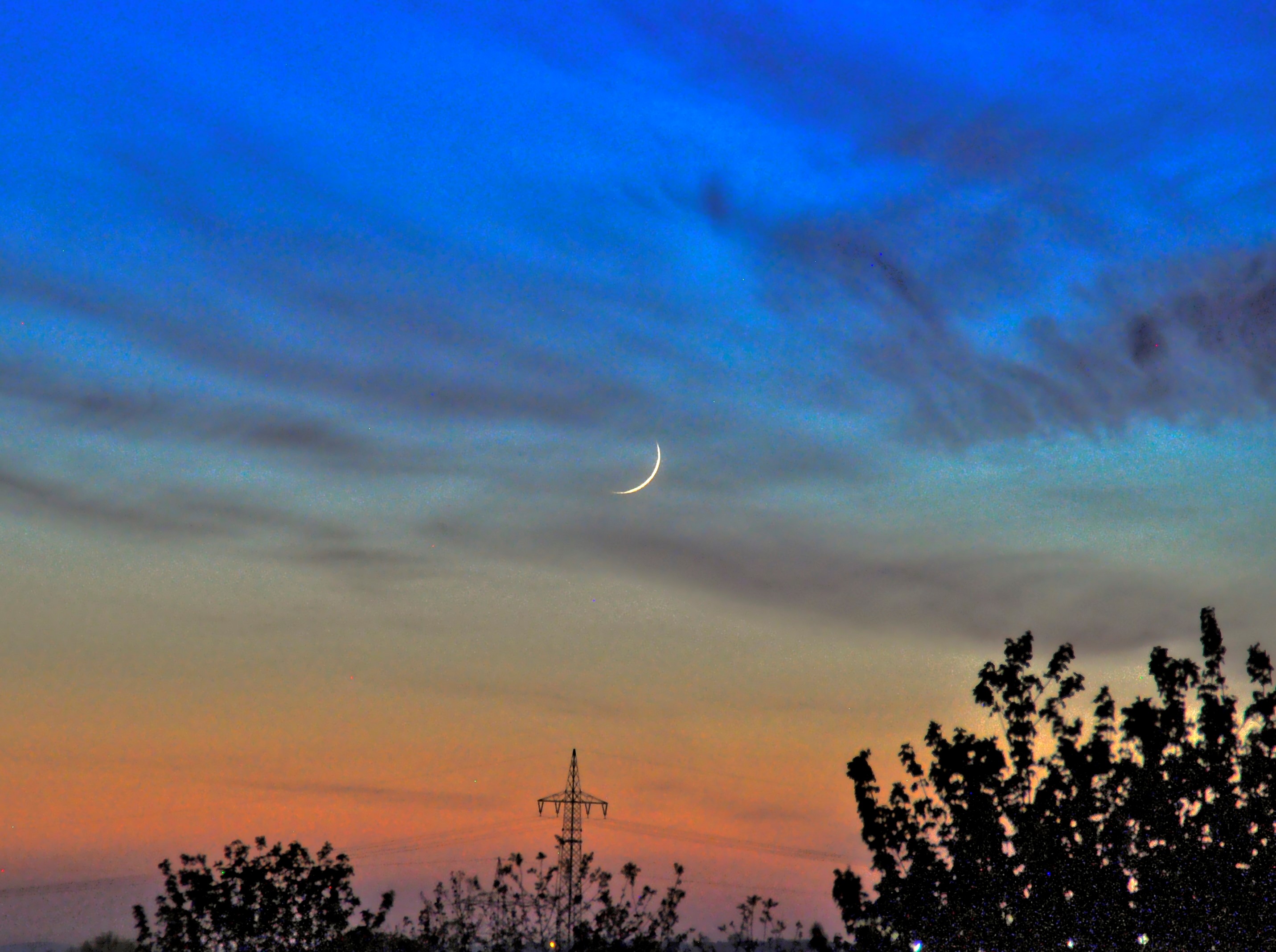 Gestern Abend erblickte ich die ganz schmale Mondsichel aus dem Dachfenster und habe rasch meine Nikon mit dem 200-mm-Objektiv herausgeholt