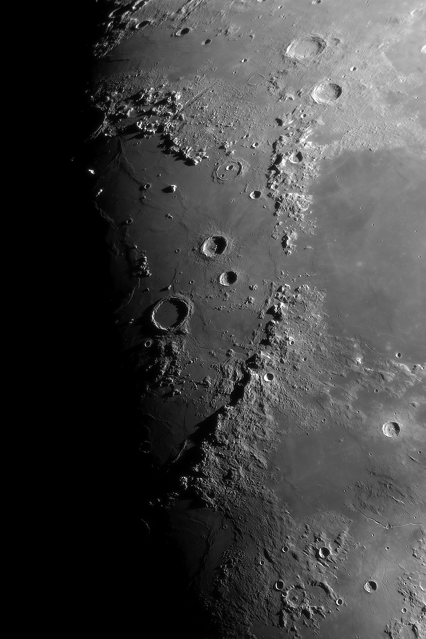Wunderschöne Phase, um die Kettengebirge auf dem Erdmond zu studieren. Oben die Alpen mit dem Alpenquertal, daneben der Kaukasus, unten die Apenninen. Der einzeln stehende Berg Piton (2200 m) mit seinem Schatten ist immer eine Augenweide. Eine meiner Lieblingsregionen auf dem Mond. Oben rechts Aristoteles (oben), darunter Eudoxus. Archimedes mit seinem perfekten Ringgebirge, daneben die beiden Krater Aristillus (oben) und Autolycus. Viele Berge werfen herrliche, spitze lange Schatten…
