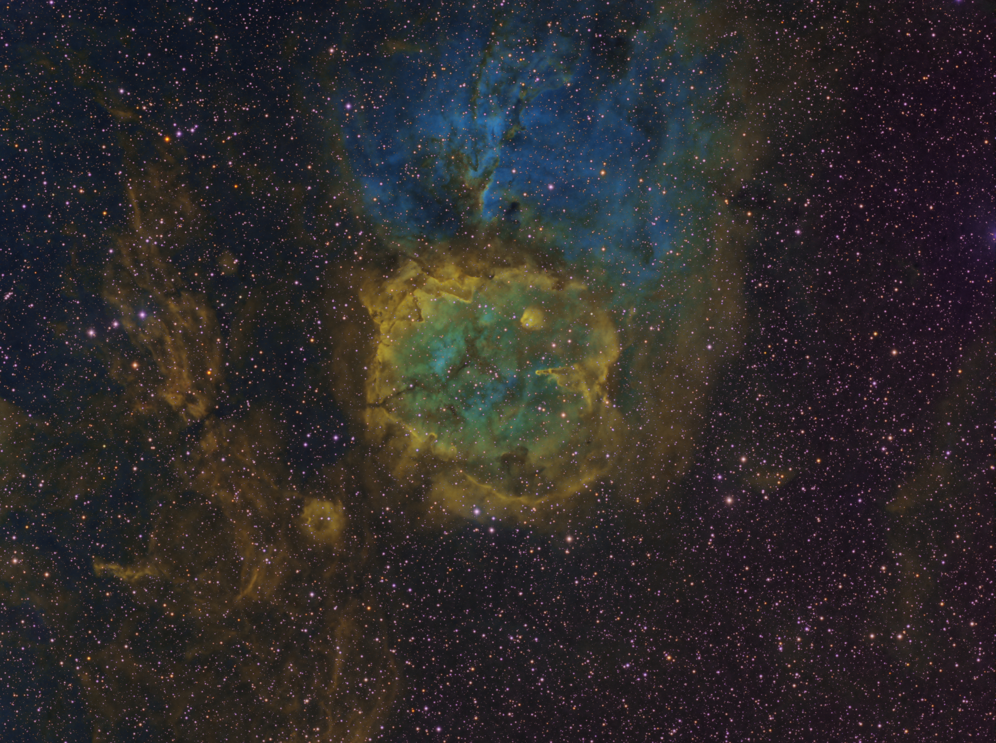 Die Aufnahmen entstand in mehreren Nächten vom 22.12.2023. bis 03.02.24 mit einer Remote-Sternwarte in New Mexico. Aufgenommen wurden mit S-II-, H-alpha- und O-III-Filtern. Die Belichtungsdauer betrug insgesamt 32 Stunden, zusammengesetzt aus 19 halbstündigen Aufnahmen im S-II-, 26 im H-alpha- und 19 im O-III-Licht. Bearbeitet wurde das in der Hubble-Palette dargestellte Summenbild mit Pixinsight und Affinity Photo.