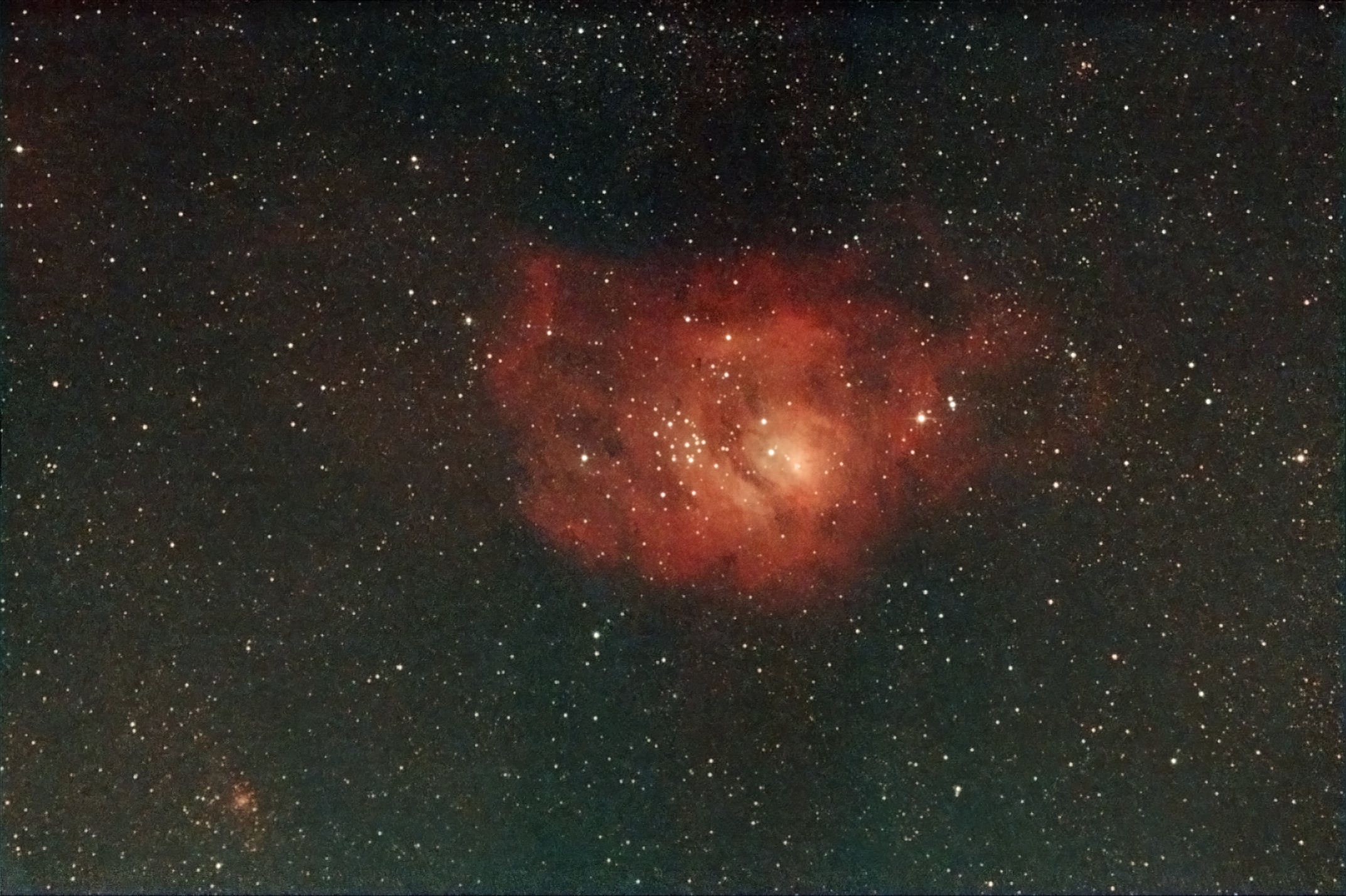 Den berühmten Lagunennebel Messier 8 nebst offenem Sternhaufen NGC 6530 von meinem Balkonstandort unter den dortigen spezifischen Bedingungen zu fotografieren gleicht dem Versuch, mit einer Schnorchelausrüstung den Marianengraben hinab zu tauchen (und das dann auch noch zu überleben!). Für dieses Vorhaben war ein extrem genaues Timing zwischen Sichtbarwerden an meiner Hauswand und dem Verschwinden des Objektes in Horizontnähe einschließlich dortiger Wohnbebauung vonnnöten. Wenn dann noch - wie in meinem Fall - zeitweilig horizontnahe Wolken und Dunst störten, wurde die Aufnahmesession schon so gut wie aussichtslos. Trotzdem war ich herausgefordet und entsprechend motiviert, Messier 8 auf dem Sensor meiner EOS 1100 Da zumindest sichtbar zu machen. Wie sich zeigte, eine ganz persönliche astrofotografische Herausforderung der besonderen Art. Links unten im Bild ist noch der Kugelsternhaufen NGC 6544 zu erkennen. Die Anzahl der Lightframes war natürlich sehr begrenzt, trotzdem bin ich zufrieden, zumal ich vielleicht späterhin noch photonensammelmäßig werde nachlegen können…