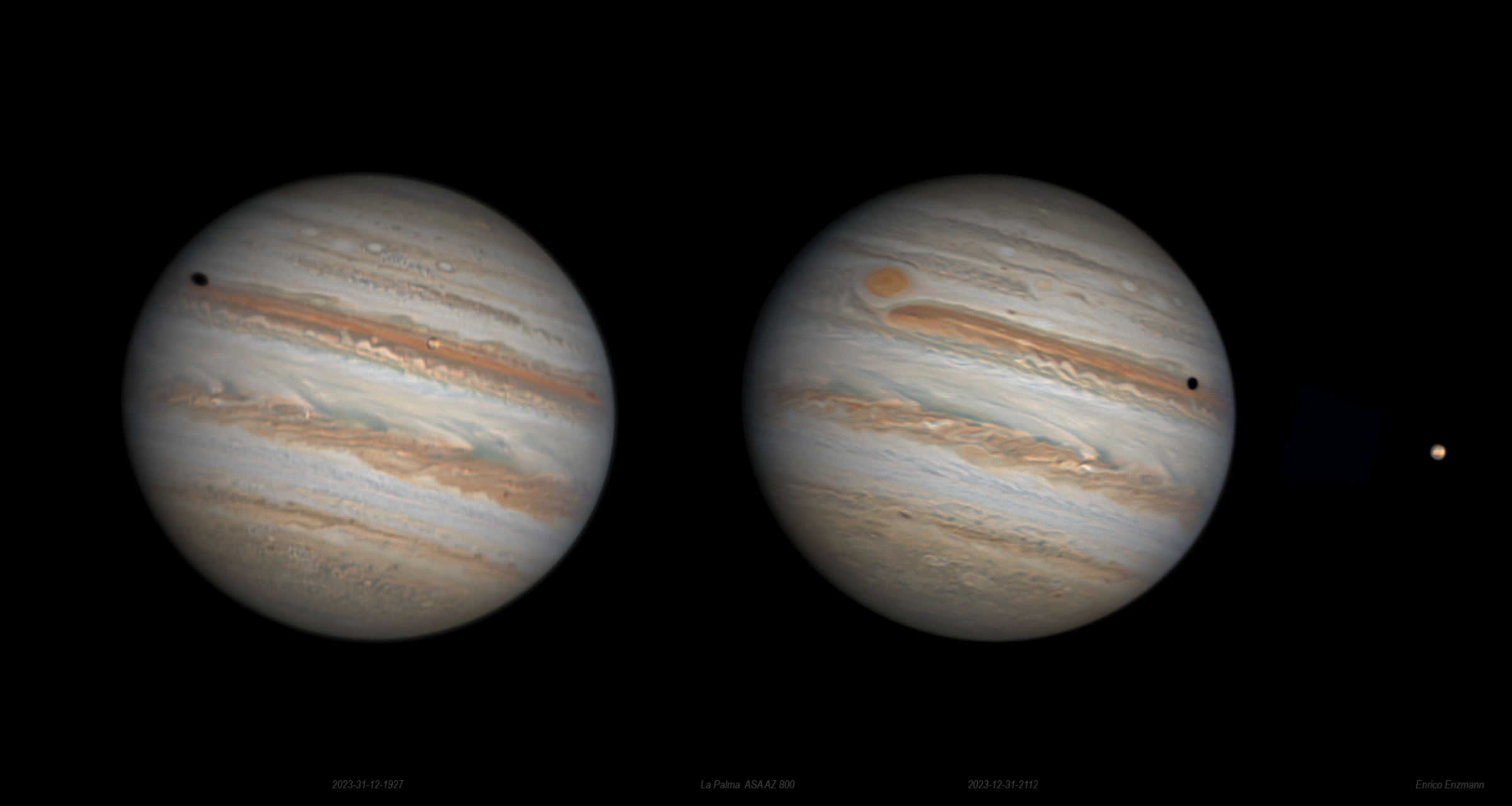 In der Silvesternacht 2023 war auf La Palma gutes Seeing und ich konnte diese beiden Bilder von Jupiter im Abstand von rund zwei Stunden machen. Die linke Aufnahme zeigt Jupiter mit vielen Details in seinen Wolkenschichten gegen 20:27 Uhr deutscher Zeit sowie den Mond Io vor Jupiter in dem oberen dicken Band und dessen Schattenwurf auf Jupiter. Im zweiten rechten Bild knapp zwei Stunden später, 22:12 Uhr deutscher Zeit, ist der Mond weiter rausgewandert, der Schattenwurf von Io ist allerdings noch auf Jupiter zu sehen. Auch gesellt sich der Große Rote Fleck dazu.