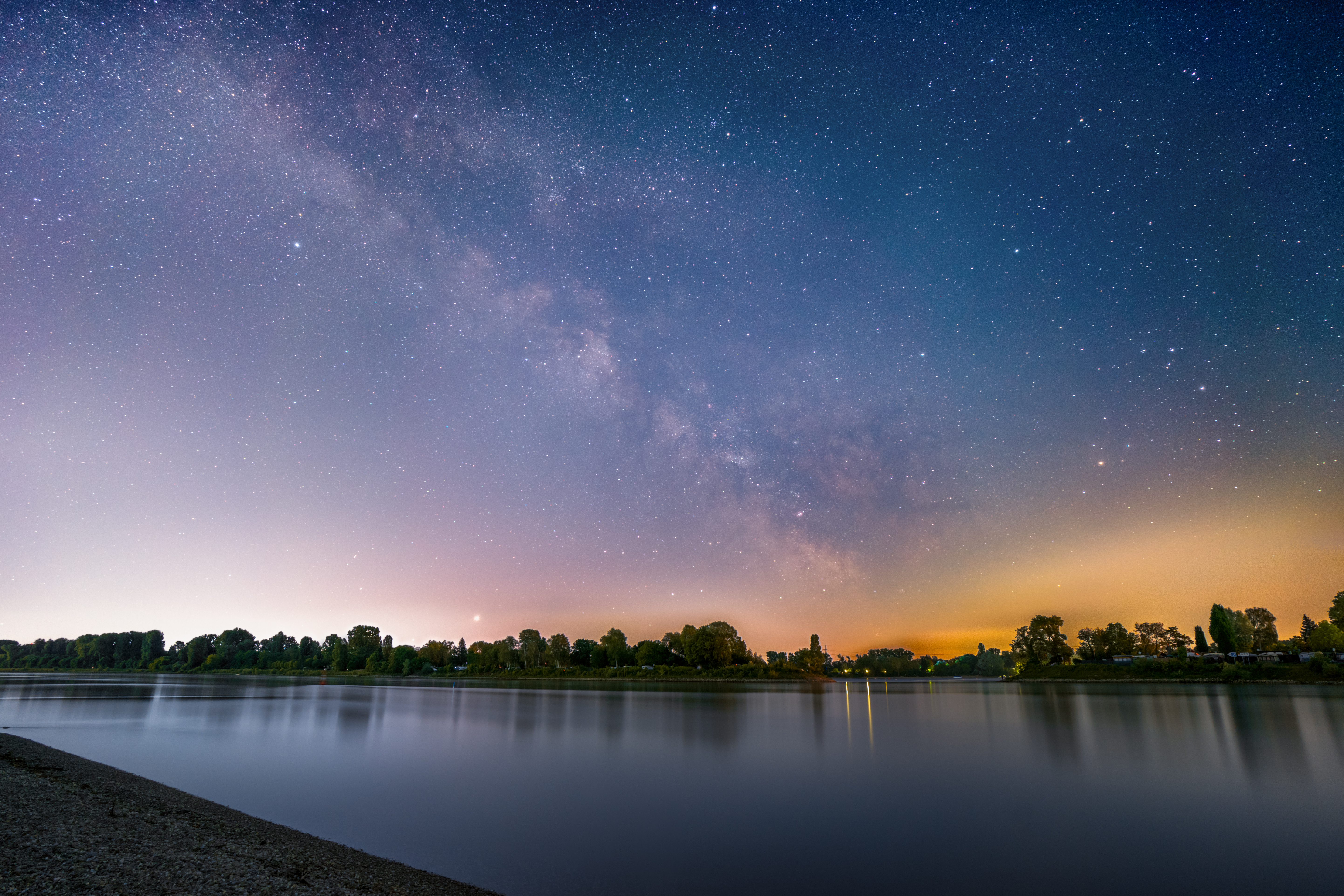 Das vorliegende Bild habe ich vom Strandbad Mannheim aus aufgenommen. Zu sehen ist das Band der Milchstraße über dem Rhein. Ebenfalls zu sehen ist der hell erscheinende Planet Jupiter. Gegen die hohe Lichtverschmutzung am Rande der Stadt hatte ich zwar einen speziellen Filter im Einsatz, dennoch musste ich die Rohbilder massiv digital prozessieren um die Milchstraße kontrastreich darstellen zu können.