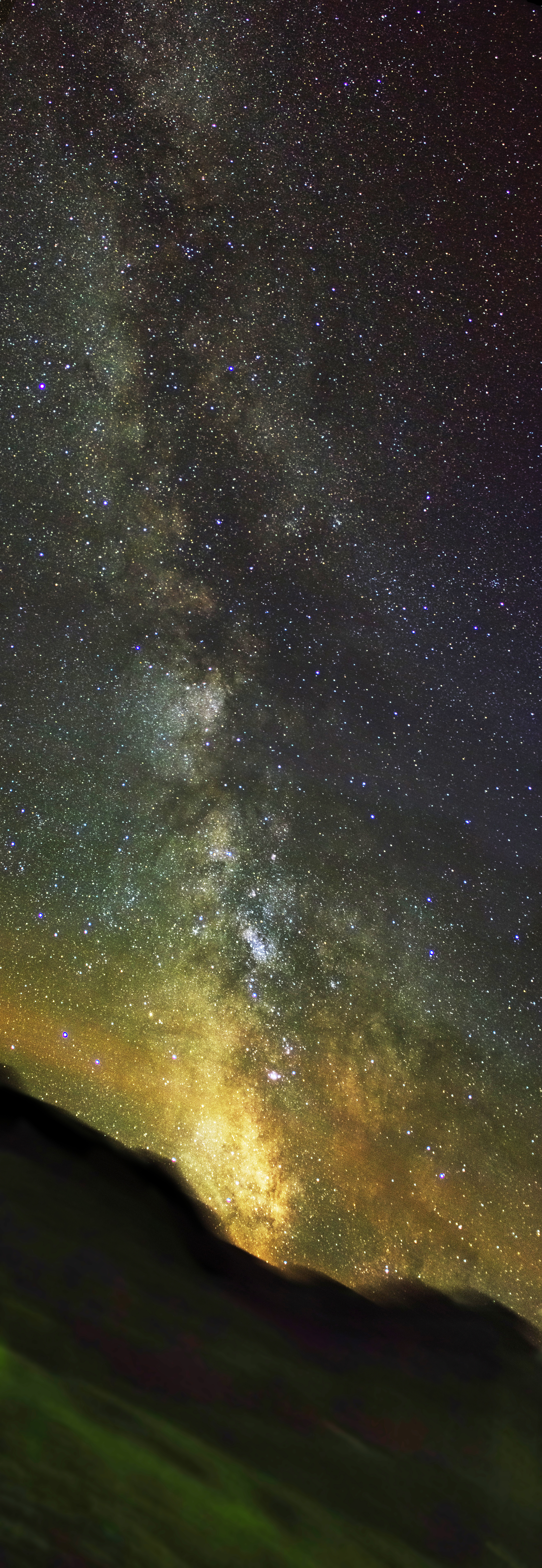 Die Aufnahme zeigt die Sommermilchstraße über den Dolomiten. Das Bild besteht aus mehreren Einzelaufnahmen, die mit Registax ausgerichtet und "gestackt" wurden, um so das Rauschen zu minimieren. Das hat zur Folge, dass der Vordergrund unscharf ist.