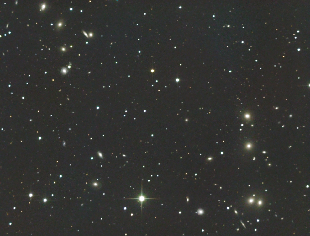 Hoch oben, an der Grenze von Löwe und dem Haar der Berenike finden wir einen Ort am Himmel, der vielen wohl unbekannt ist, aber dennoch unsere Aufmerksamkeit und Bewunderung verdient. Hier tummeln sich auf einer Fläche von 45 x 30 Bogenminuten nicht weniger als 20 Galaxien, von denen die Hälfte fast gleich hell sind und alle diese NGC-Nummern aufweisen. Es handelt sich hier hauptsächlich um E- und SO-Galaxien. Ihre Entfernung liegt zwischen 280 und 320 Millionen Lichtjahren, also gleich weit wie der Coma-Galaxienhaufen Abell 1656, der aber 15 Grad nordöstlich liegt .Die scheinbaren Helligkeiten liegen bei 12,7 bis 13,5 mag. Alle Galaxien passten genau auf den Chip meiner SXV-9 und ich belichtete, von dieser meiner Entdeckung fasziniert, fast 11 Stunden mit LRGB. Ein Aufsuchen und Ansehen mit einem 40-cm-Dobson wäre sicher ein aufregendes Erlebnis!