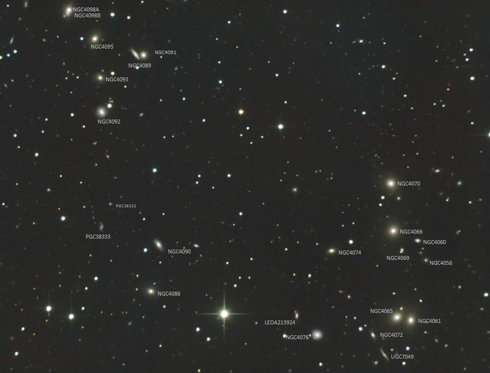 Hoch oben, an der Grenze von Löwe und dem Haar der Berenike finden wir einen Ort am Himmel, der vielen wohl unbekannt ist, aber dennoch unsere Aufmerksamkeit und Bewunderung verdient. Hier tummeln sich auf einer Fläche von 45 x 30 Bogenminuten nicht weniger als 20 Galaxien, von denen die Hälfte fast gleich hell sind und alle diese NGC-Nummern aufweisen. Es handelt sich hier hauptsächlich um E- und SO-Galaxien. Ihre Entfernung liegt zwischen 280 und 320 Millionen Lichtjahren, also gleichweit wie der Coma-Galaxienhaufen Abell 1656, der aber 15 Grad nordöstlich liegt .Die scheinbaren Helligkeiten liegen bei 12,7 bis 13,5 mag. Alle Galaxien passten genau auf den Chip meiner SXV-9 und ich belichtete, von dieser "meiner" Entdeckung fasziniert, fast 11 Stunden mit LRGB. Ein Aufsuchen und Ansehen mit einem 40-cm-Dobson wäre sicher ein aufregendes Erlebnis!