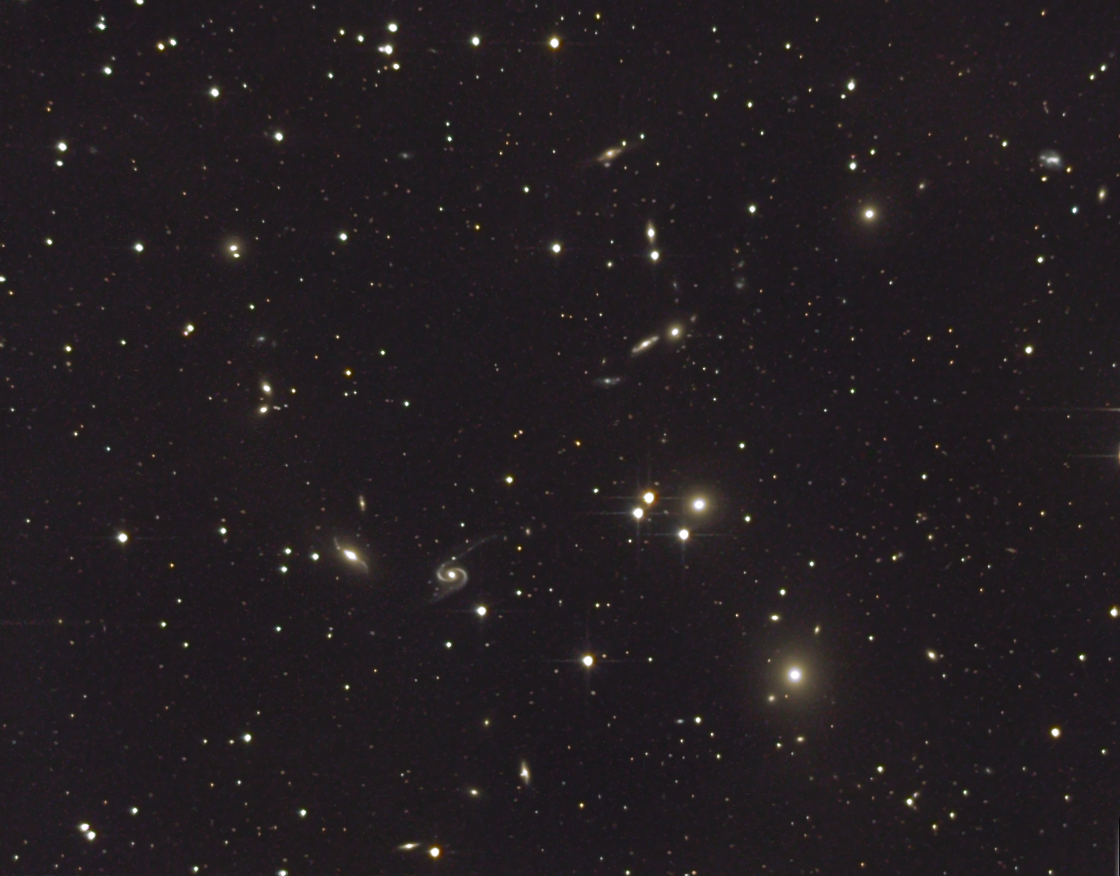 Diese interessante Galaxiengruppe sieben Grad südlich von Sirrah beinhaltet Galaxien unterschiedlicher Typen (10 NGC-Objekte!) in 230 bis 250 Millionen Lichtjahren Entfernung. Die scheinbaren Helligkeiten liegen bei 12,2 bis 14,6 mag. Die 13,8 mag helle Galaxie NGC 90 (Typ SBc) und die 13,6 mag helle NGC 93 (Typ Sb mit warped disc) bilden das wechselwirkende Paar Arp65. Aufnahmen von 2007, 2015 und 2022 ergaben zusammen 9h 20m Belichtungszeit.