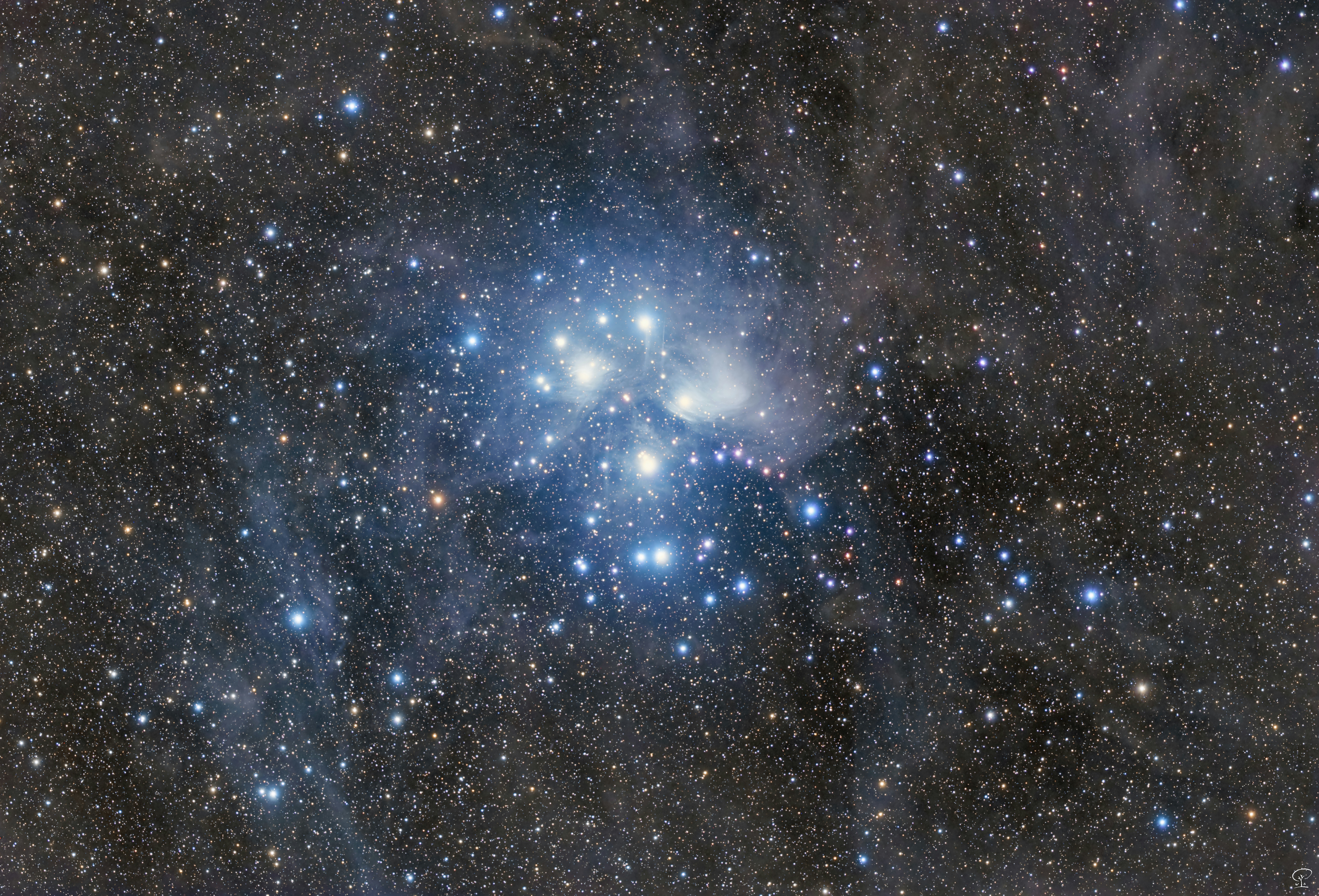 Mit einer lichtstarken Optik kommen nach einigen Stunden Belichtungszeit die schwach illuminierten Staubwolken in der Umgebung der Plejaden zum Vorschein.