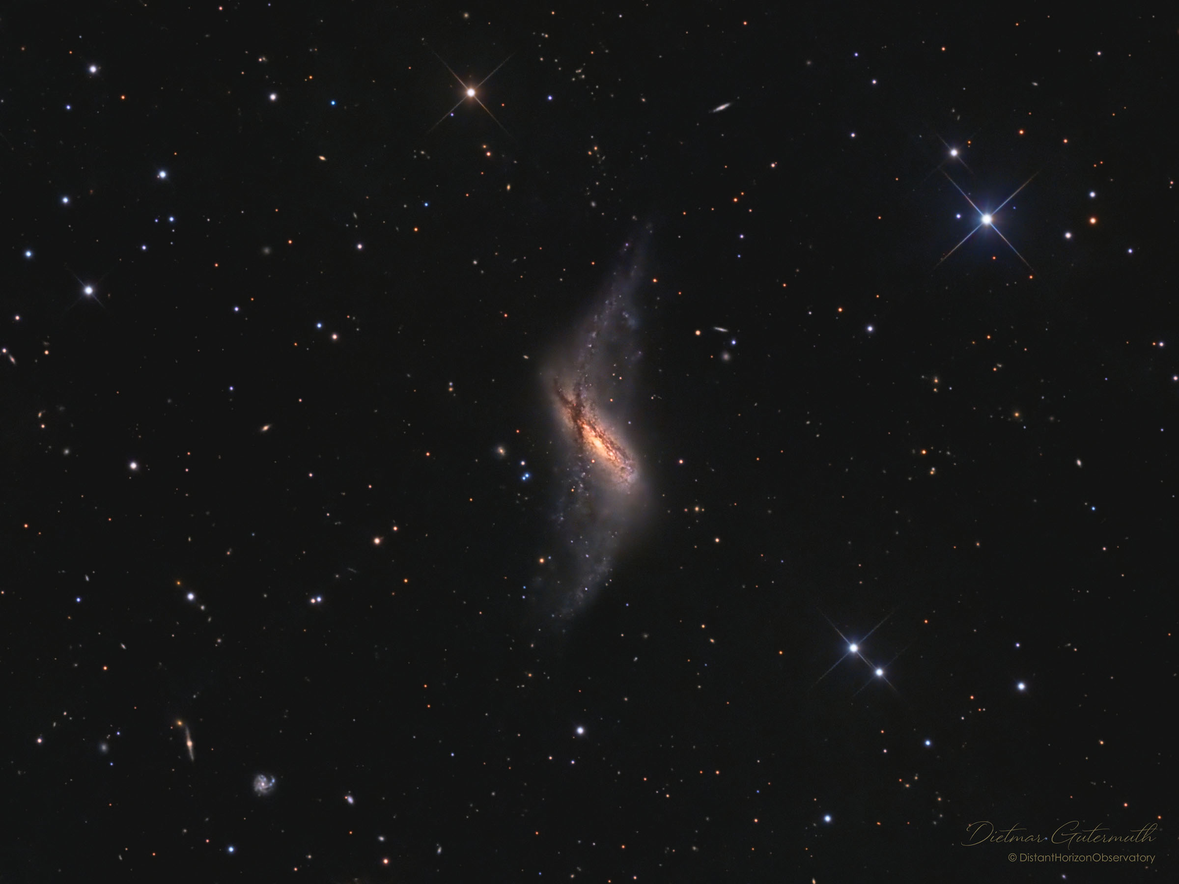 Die Balkenspirale NGC 660 im Sternbild Fische ist etwa 42 Millionen Lichtjahre entfernt und wurde 1784 von Wilhelm Herschel entdeckt. Ihr seltsames Aussehen kennzeichnet sie als Polarring-Galaxie. Es sind nur sehr wenige dieser Exoten bekannt und die Entstehung gibt den Astronomen einige Rätsel auf. In einem Ring, welcher stark zur Ebene der Galaxie geneigt ist, kreist eine beträchtliche Population aus Sternen, Gas und Staub. Es gibt einige Ansätze dafür, diese bizarre Anordnung zu erklären. Es wäre z. B. möglich, das von einer vorbeiziehenden Galaxie Materie abgezogen wurde, die nun auf einer kreisförmigen Bahn rotiert. Auf sehr tiefen Aufnahmen des Gemini-Observatory (8-m-Teleskop auf Mauna Kea, Hawaii) wurde innerhalb dieses Ringes eine sehr große Anzahl von Wasserstoffwolken und Sternentstehungsgebieten nachgewiesen, was dafür sprechen würde, das wir bei NGC 660 gerade zwei Galaxien beobachten, die sich gegenseitig durchdringen. In welchem Stadium dieses sehr dynamische System endet und wie stabil dieser Zustand sein wird, ist derzeit vollkommen offen. Die jüngsten Sterne im Ring von NGC 660 sind erst sieben Millionen Jahre alt, dies entspricht etwas mehr als einem Promille des Alters unserer Sonne!