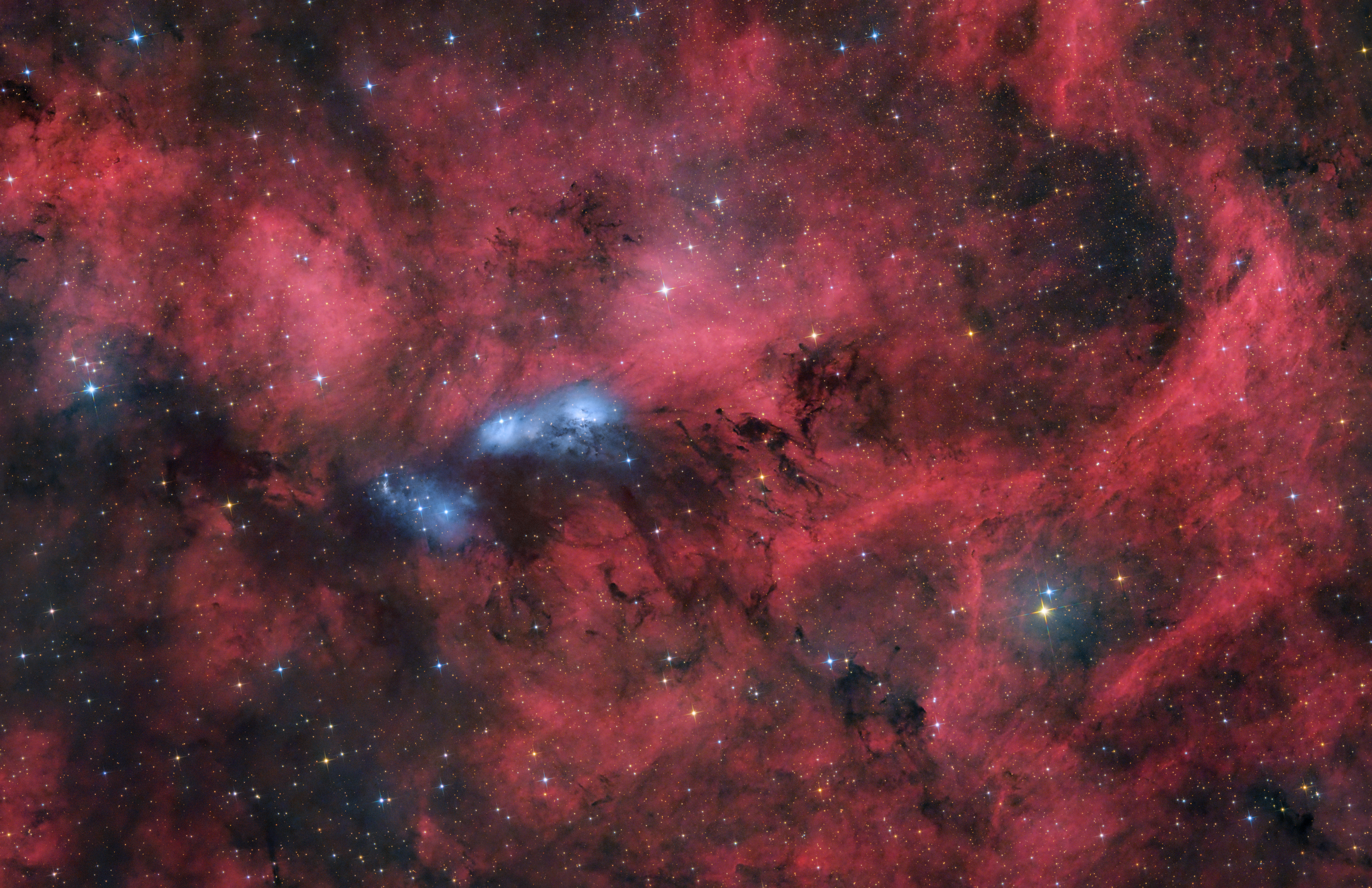 Nördlich des Sterns Sadr (γ Cygni) im Sternbild Schwan liegen in einer Entfernung von etwa 6000 Lichtjahren die Reflexionsnebel NGC 6914, VdB 131 & 132, deren blaues Sternenlicht von den umgebenden Staubwolken reflektiert wird. Eingebettet sind sie in reichhaltige Wolken aus Wasserstoff, die von jungen, heißen Sternen zum Leuchten angeregt werden, sowie einige spektakuläre Dunkelnebel (u.a. LDN 897, 899 und 900). Für die Bearbeitung standen mir fünf Stunden RGB- und drei Stunden H-alpha-Daten zur Verfügung, aufgenommen in den letzten Nächten mit dem 200/1000 Newton, der durch den Starizona Nexus auf eine Brennweite von 750 mm bei f/3.75 reduziert wurde. Die Herausforderung bestand für mich darin, die optimale Farb- und Helligkeitsbalance zwischen den Reflexionsnebeln und den H-Alpha-Gebieten zu finden und möglichst viele Details herauszuarbeiten (u. a. in den Dunkelnebeln), ohne dabei die »Fluffigkeit« der Gasnebel zu verlieren.