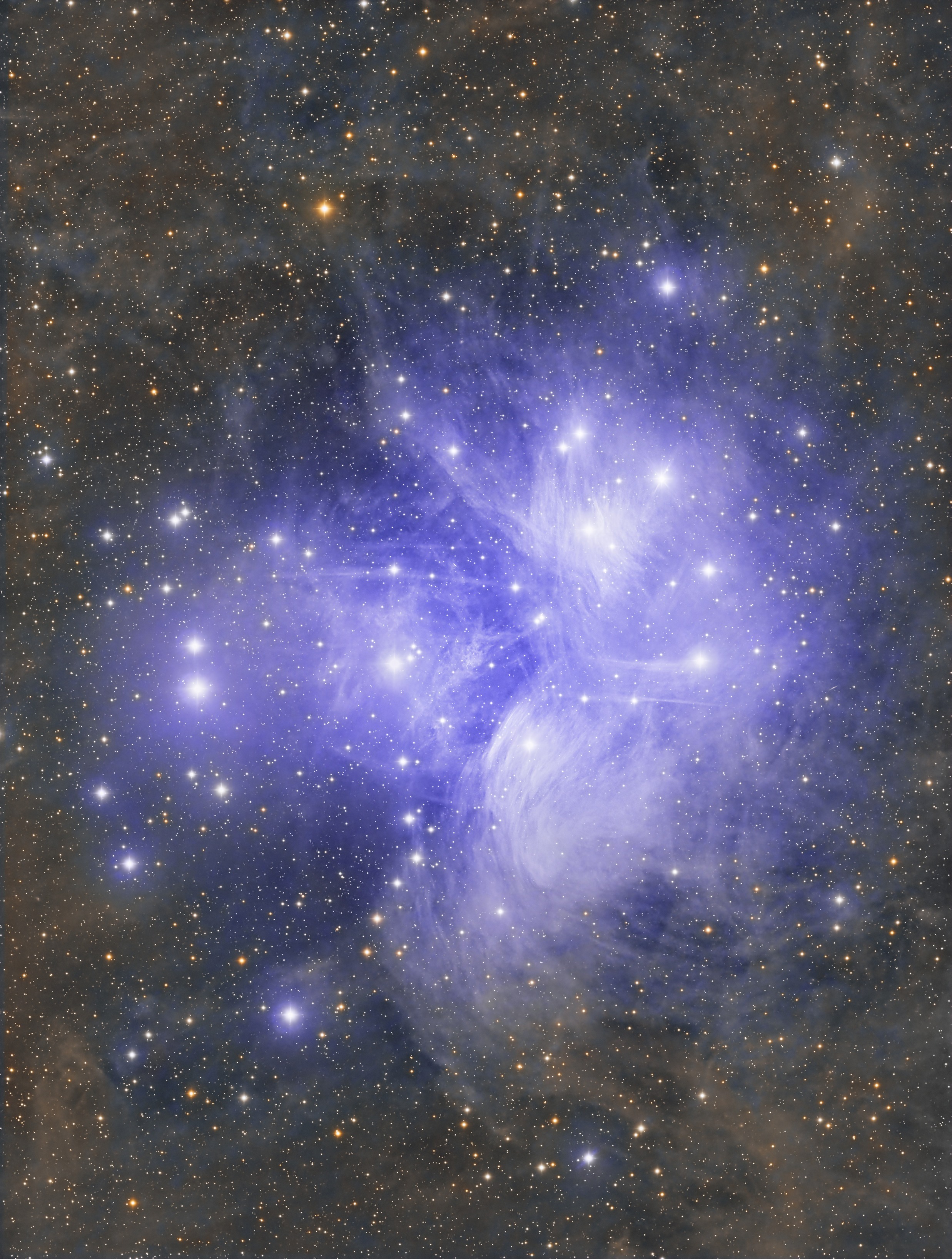 Messier 45, besser bekannt als die Plejaden, ist ein prachtvoller offener Sternhaufen. In der Mythologie wurden die sieben Schwestern (Plejaden) durch Zeus in Tauben verwandelt um sie vor dem Jäger Orion zu beschützen der an ihnen Gefallen fand. Darum finden sich die Plejaden auch in der Nähe des Sternbildes Orion.