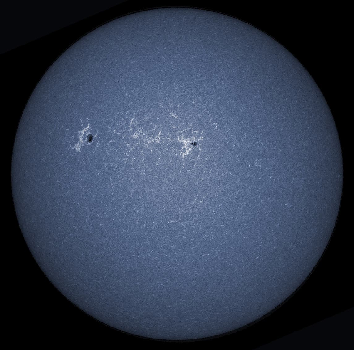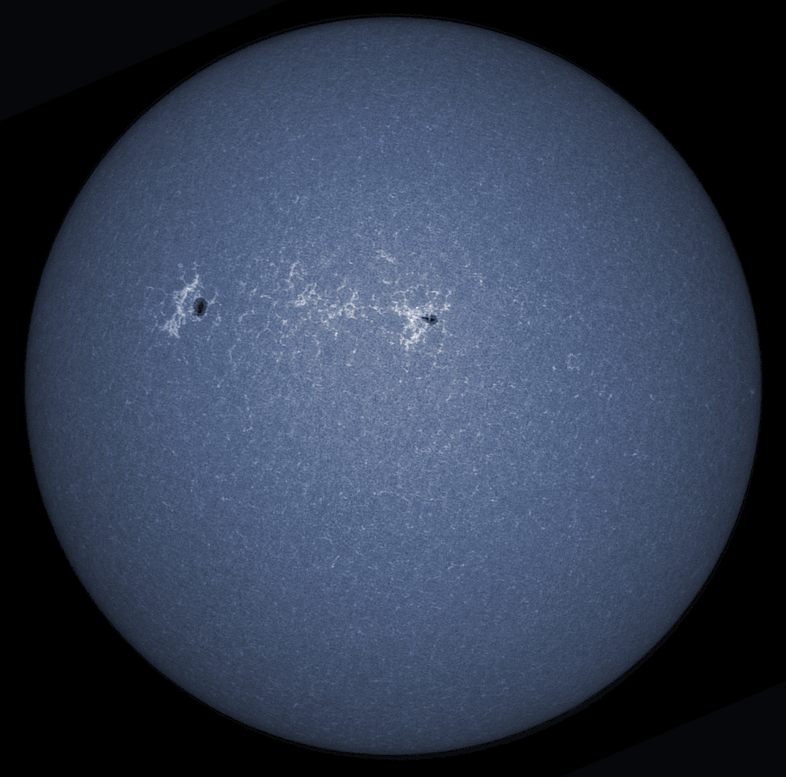 Am kontrastreichsten heben sich Flecken vor der Sonnenscheibe ab, wenn sie mit einem Ca-K-Filter aufgenommen werden.