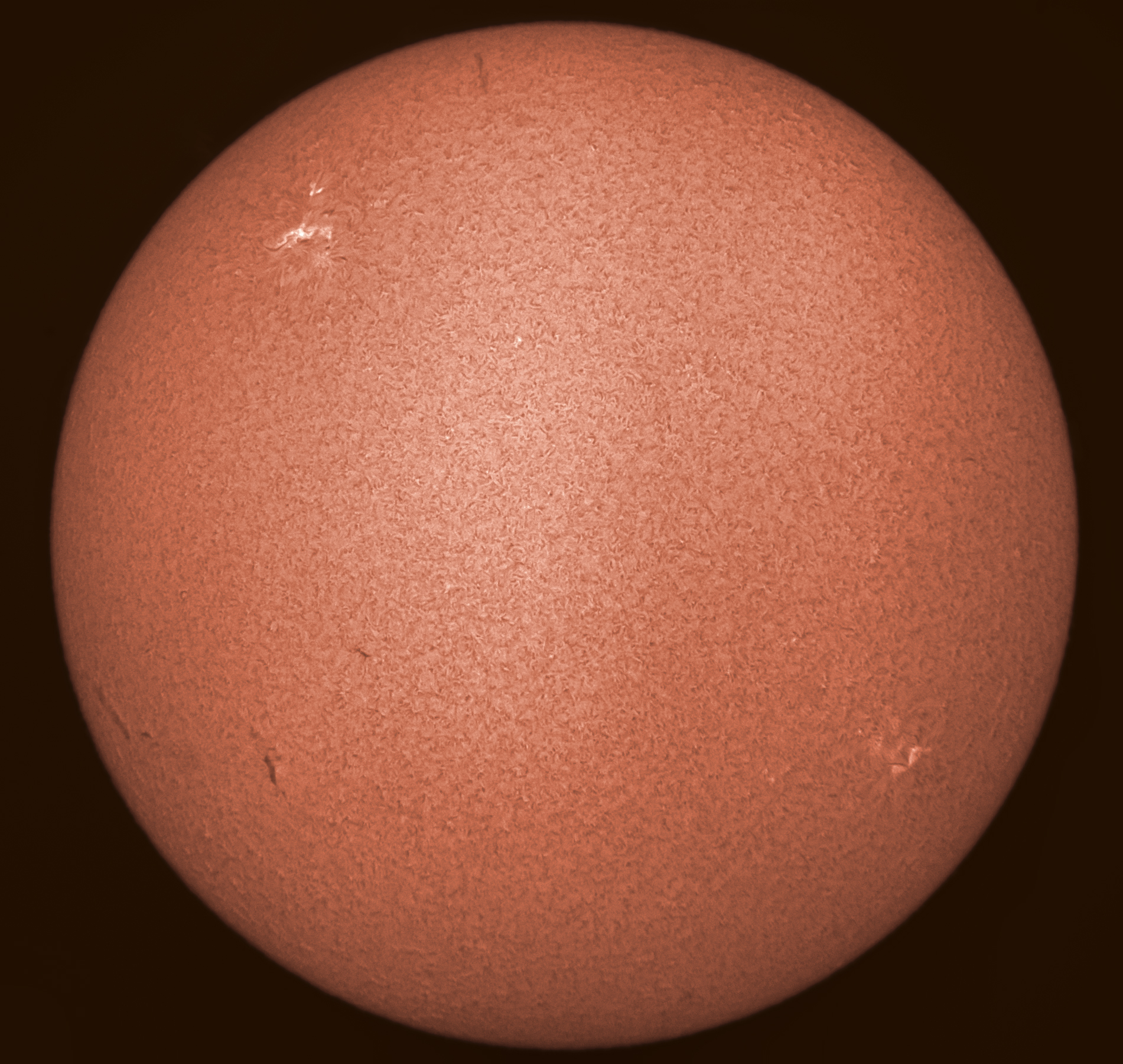 Die Aufnahme im Licht der Alpha-Linie des Wasserstoffs zeigt, dass nach vier M-Klasse-Flares der vorigen Woche nicht viel auf unserem Tagesgestirn los ist. Vielleicht treibt die Fleckengruppe 2644 auf der Sonnenrückseite ihr Unwesen?