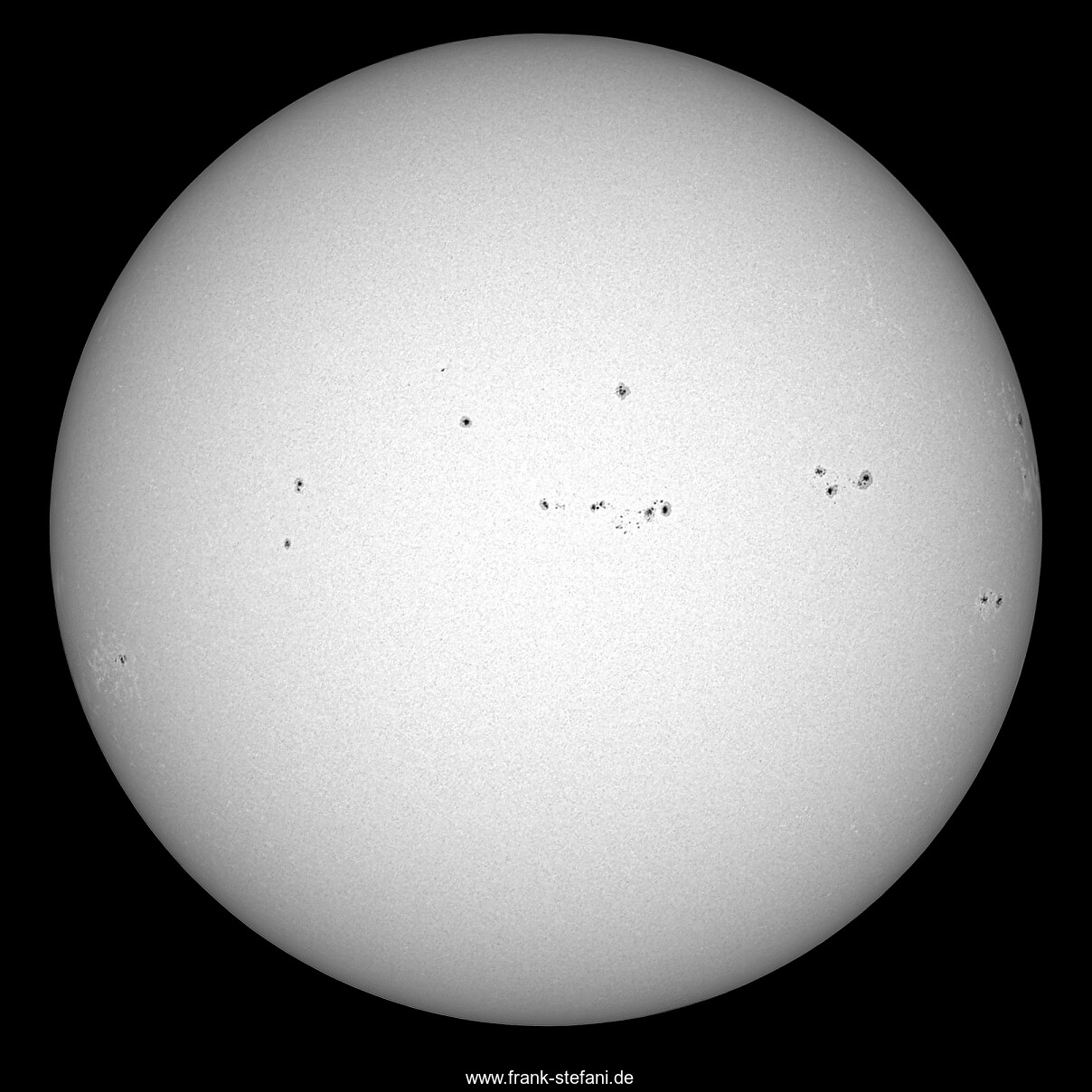 Die gegenwärtig elf aktiven Regionen AR 4165 bis AR 4178 haben weiterhin keine großen Sonnenflecke entwickelt, die im Spektrum des sichtbaren Lichtes beobachtet werden könnten. Dennoch zeigen die Fleckengruppen der AR 4172 (Mitte) und AR 4178 (rechts davon) weiterhin von Tag zu Tag spannende Veränderungen. Vor allem die Fleckengruppe der AR4178, die noch vor drei Tagen lediglich aus einem unauffälligen Punkt bestand, ist in inzwischen deutlich gewachsen und wohl auch in H-alpha durch Fackeln und Protuberanzen aufgefallen. Im westlichen (linken) Sonnenrand ist südlich des Äquators in der Randabdunkelung ein weitere kleine Fleckengruppe, inmitten mäandernder Fackelgebiete zu erkennen. Diese Gruppe hat bis heute noch keine AR-Nummer erhalten.Vermutlich wird das kurzfristig geschehen - zumal nun auch wieder südlich des Äquators mehr Aktivität stattfindet.