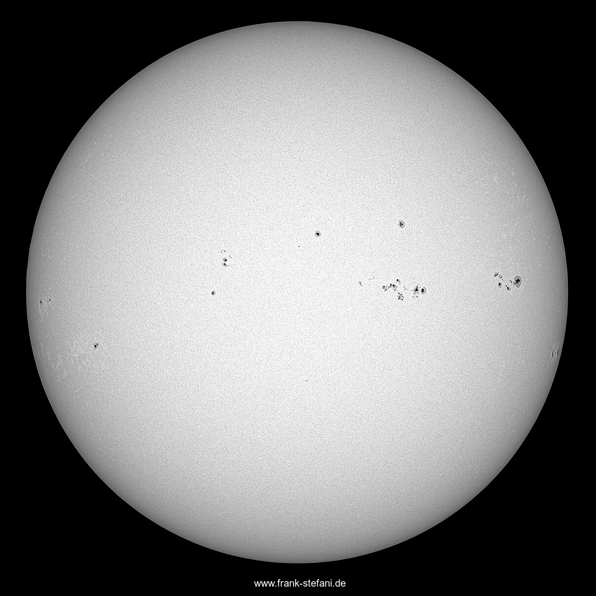 Wie es sich bereits gestern andeutete, hat sich am Westrand (links) der Sonne unterhalb ihres Äquators eine neue aktive Region gebildet: Die AR14179 liegt in einem stark verzweigten Fakelgebiet, das auch im Spektrum des sichtbaren Lichtes aufgrund der Randabdunkelung der Sonne gut zu erkennen ist. Dass dort wirklich einiges los ist, zeigt vor allem das zugehörige Magnetogramm: [https://solarmonitor.org/data/2025/08/12/pngs/shmi/shmi_maglc_fd_20250812_055844.png] Darin zeigt sich deutlich, dass diese jüngste aktive Region bereits jetzt eine gleich große Ausdehnung hat, wie AR14172, die sich heute - ebenso auffällig wie chaotisch - rechts der Bildmitte befindet. Sie hatte ich in den letzten Tagen rasant aus dem Nichts gebildet. Im Magnetogramm sieht man auch gut, dass sich die Polaritäten der aktiven Regionen südlich des Äquators genau entgegen gesetzt zu denen der nördlichen Hemisphäre verhalten: Die Pluspole (weiß) und die Minuspole (schwarz) sind sozusagen vertauscht.